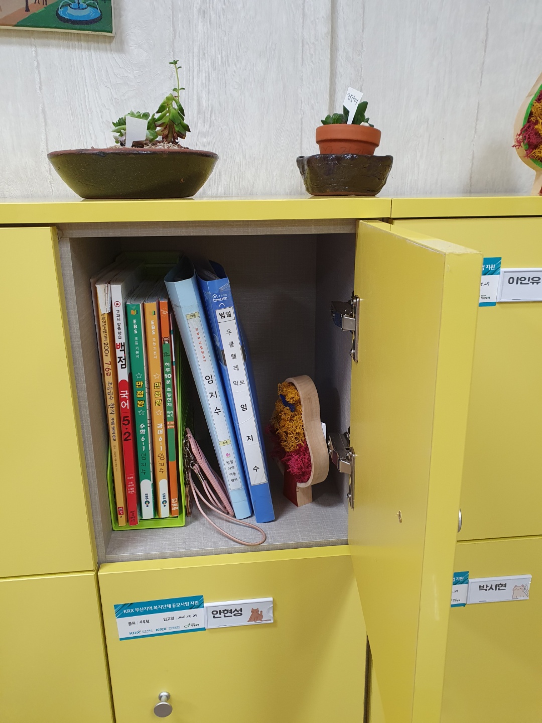 아이들이 주로 사용하는 사물함은 밝은 색으로 선택하여 아이들이 노란색의 사물함을 보고 ‘병아리 같아요.’, ‘사물함이 생겨서 좋아요’ 등 웃으며 각자의 사물함을 열어보며 살펴보는 모습을 볼 수 있었습니다.