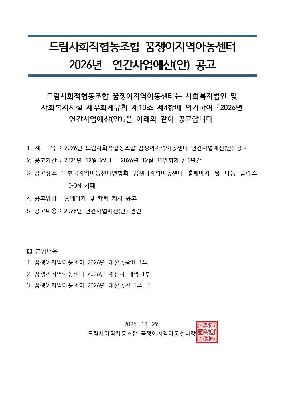 2026년 드림사회적협동조합 꿈쟁이지역아동센터 사업예산서 공고
