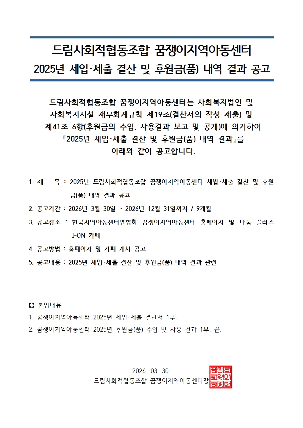 2025년 꿈쟁이지역아동센터 세입・세출결산 및 후원금(품) 내역 결과 공고