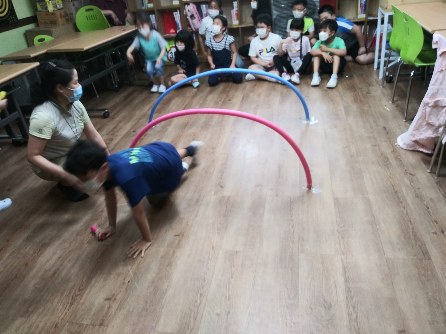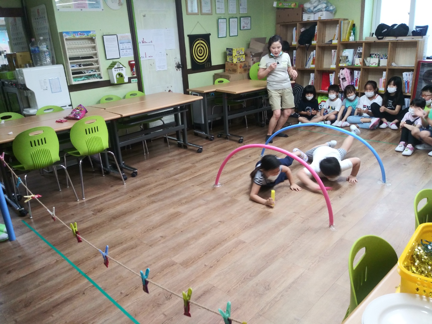 장애물을 넘어 사탕을 먹는 게임을 하면서 서로를 "우리팀 이겨라"라고 응원도 하고
