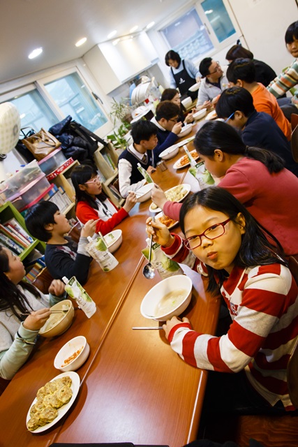 따뜻하고 맛있는 만두국과 계란에 잘입힌 동그랑땡, 아이들이 직접 담근 김치여서 그런지 더욱 맛있다며