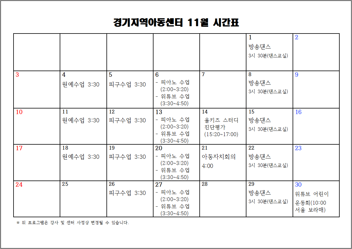 2019년 11월 시간표입니다.