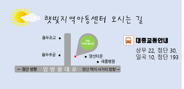 햇빛지역아동센터 | 광주광역시 북구 임방울대로1041번길 6 상가동303호(용두동,양산타운아파트) (용두동) [지도보기] Tel : 062-571-0156 Fax : 062-571-0153 E-mail : sunnykids25@naver.com
