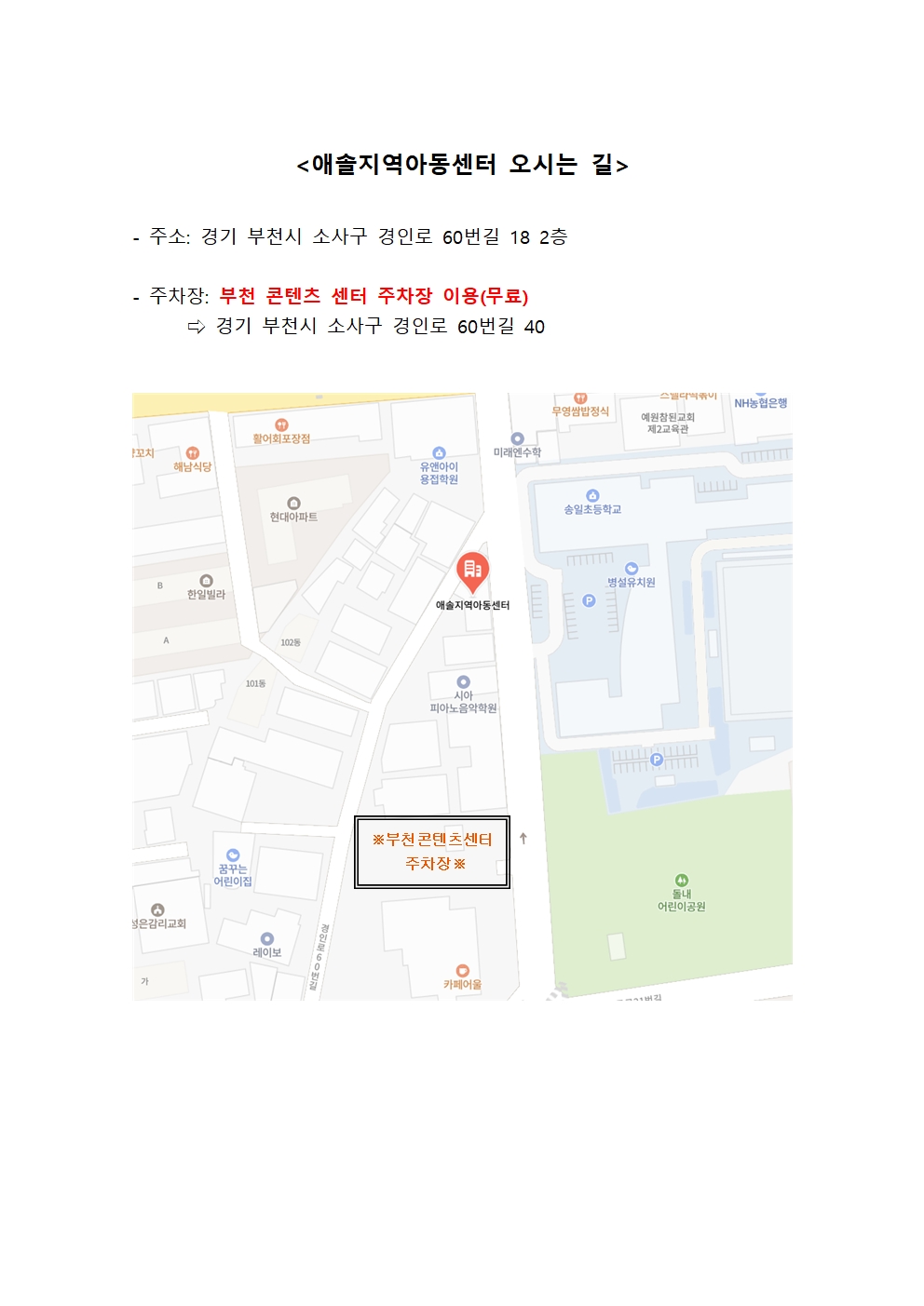 애솔지역아동센터 경기도 부천시 경인로60번길 18 2층 애솔 지역아동센터 (송내동) 070-7404-1319