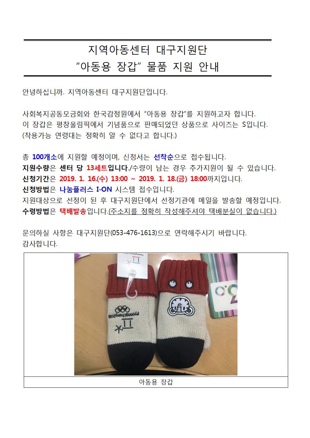 [물품] 지역아동센터 대구지원단 '아동용 장갑' 물품지원 신청 - 조기마감되었습니다.
