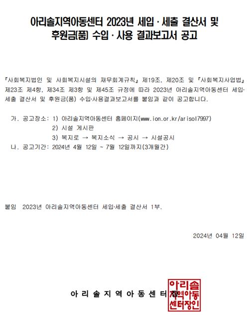 2023년도 아리솔지역아동센터 세입·세출 결산서 및 후원금(품) 수입·사용 결과보고 공고