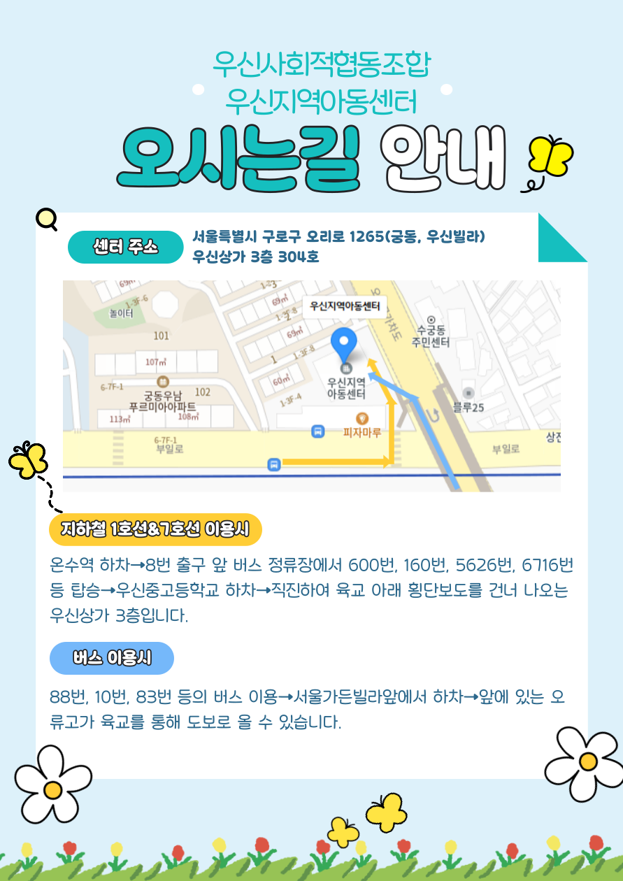 우신지역아동센터 서울특별시 구로구 오리로 1265 우신상가 304호 궁동 (궁동,우신빌라) 02-2611-8041