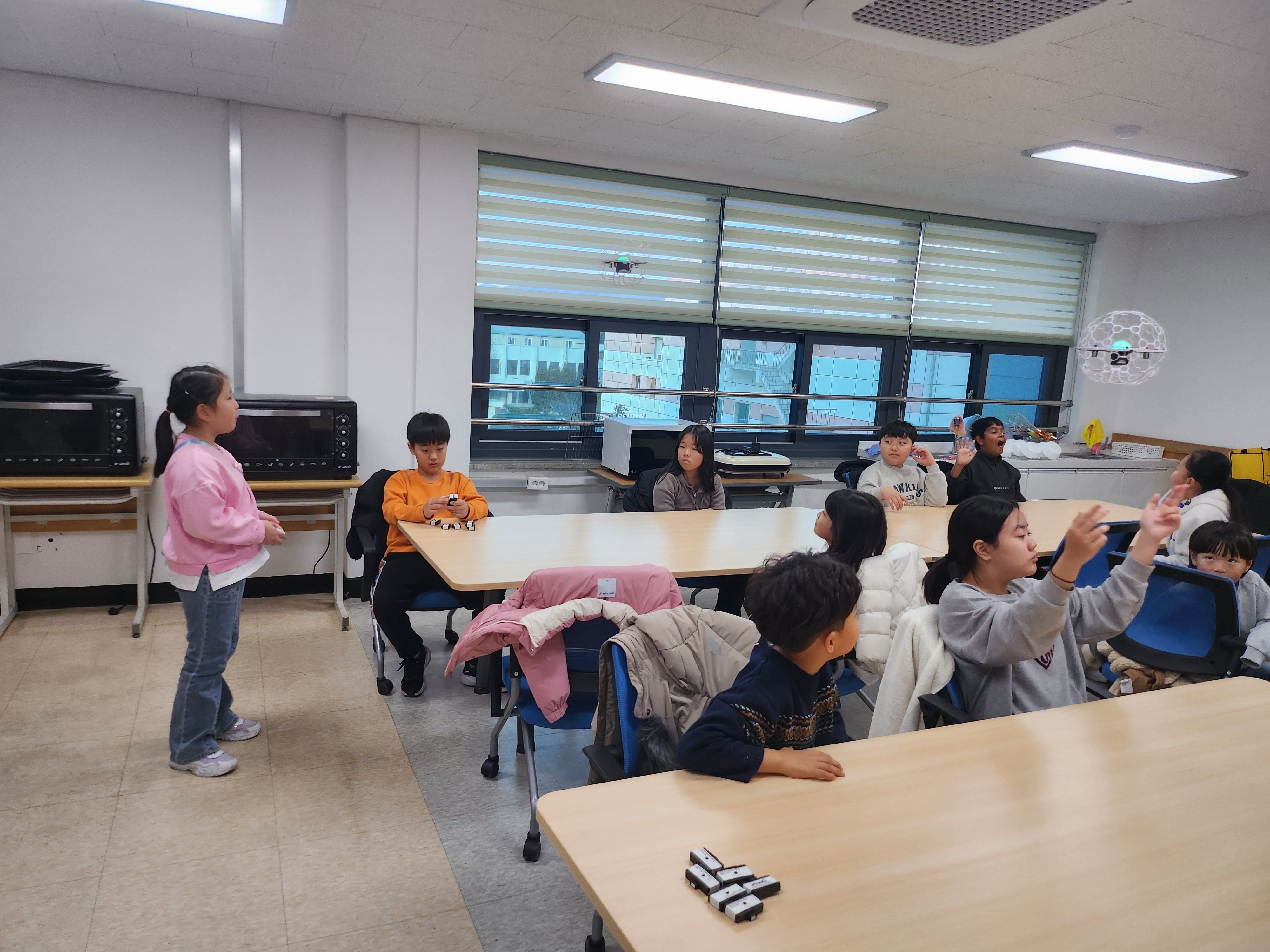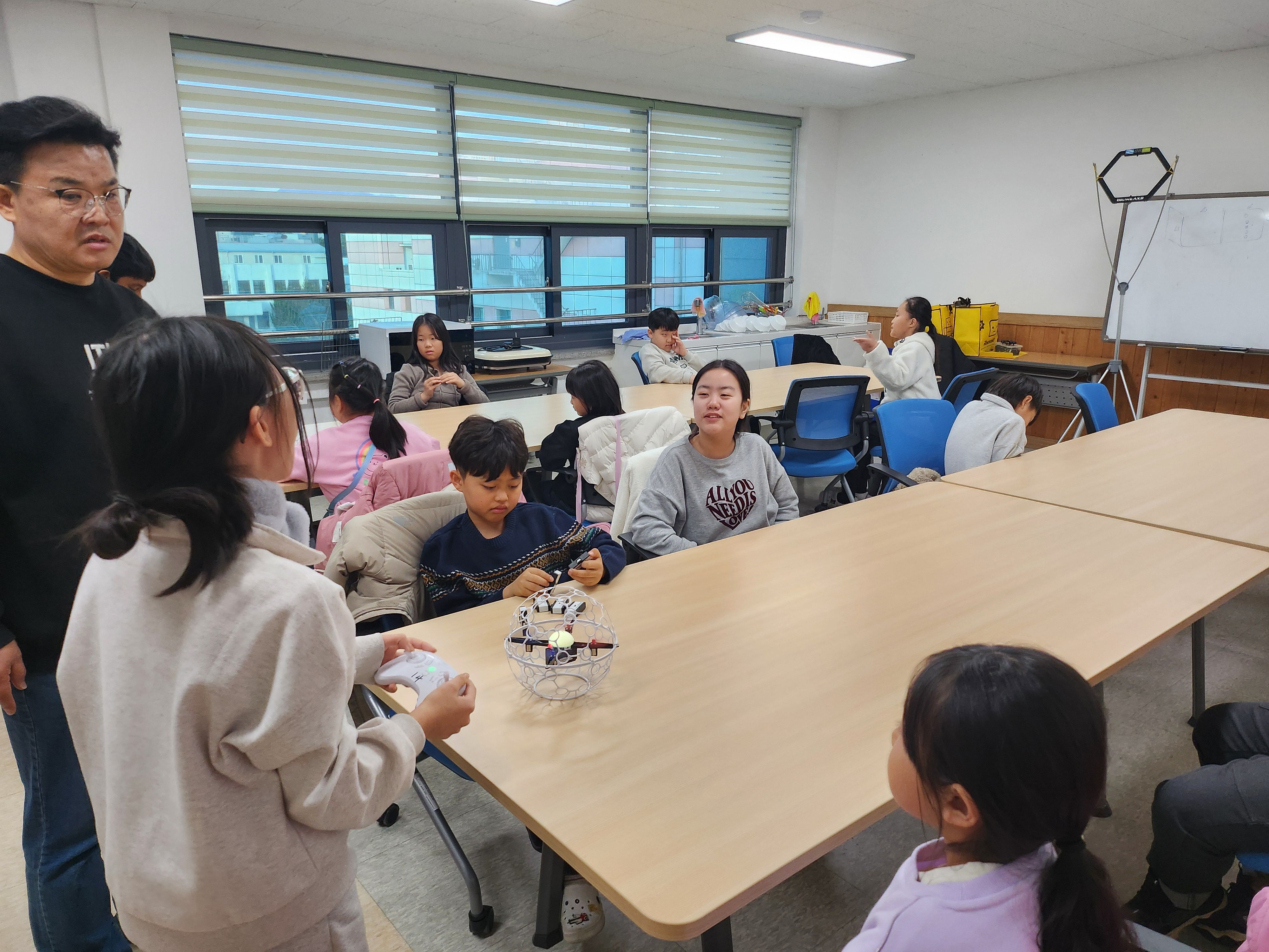 조종기가 손에 익지 않아 조종에 어려움은 있었지만 금세 적응하여 축구드론을 날리는 아이들이였습니다.