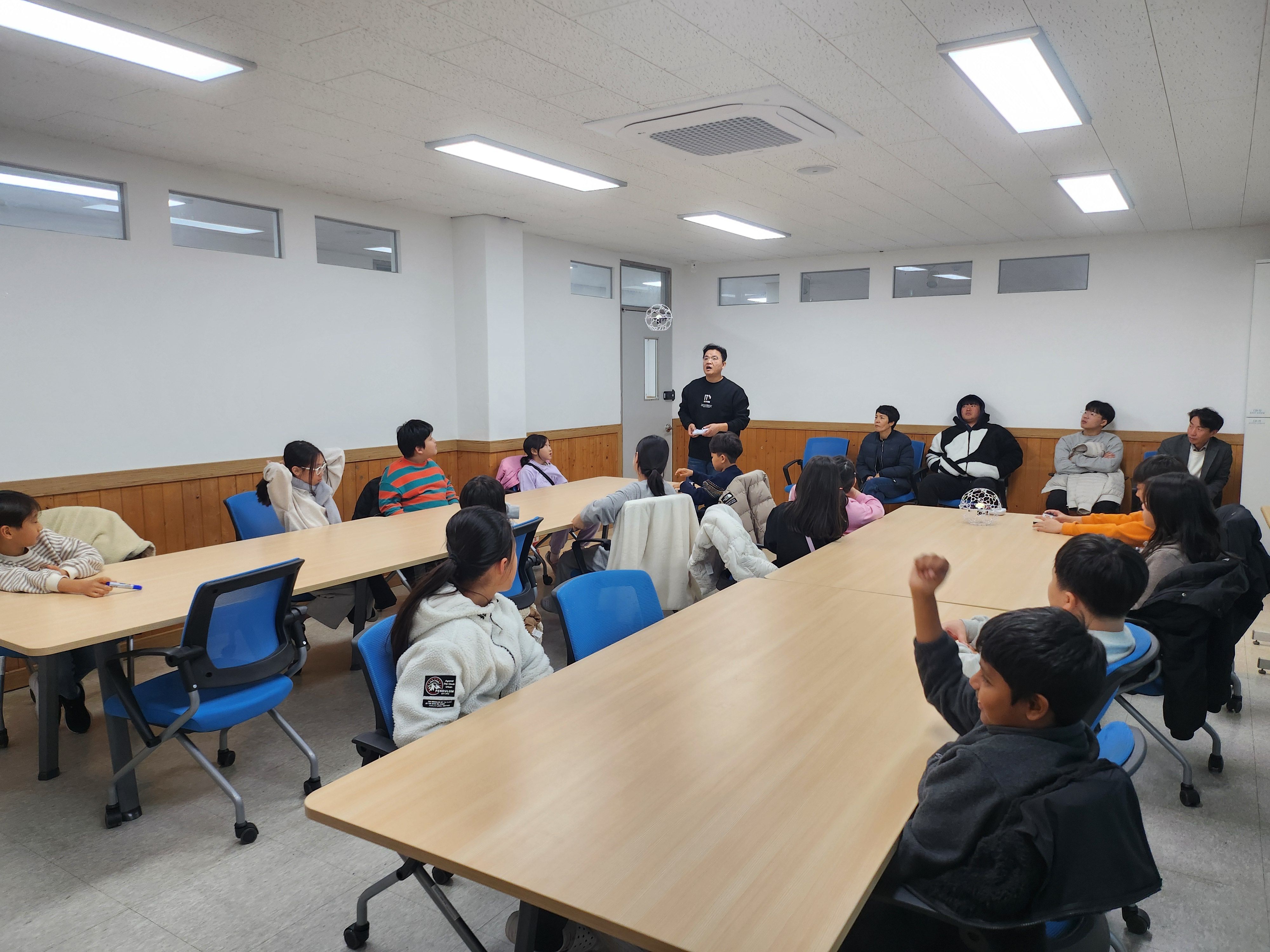 마지막 수업을 진행하며 처음 도전해보는 축구 드론을 날려 보았습니다.
