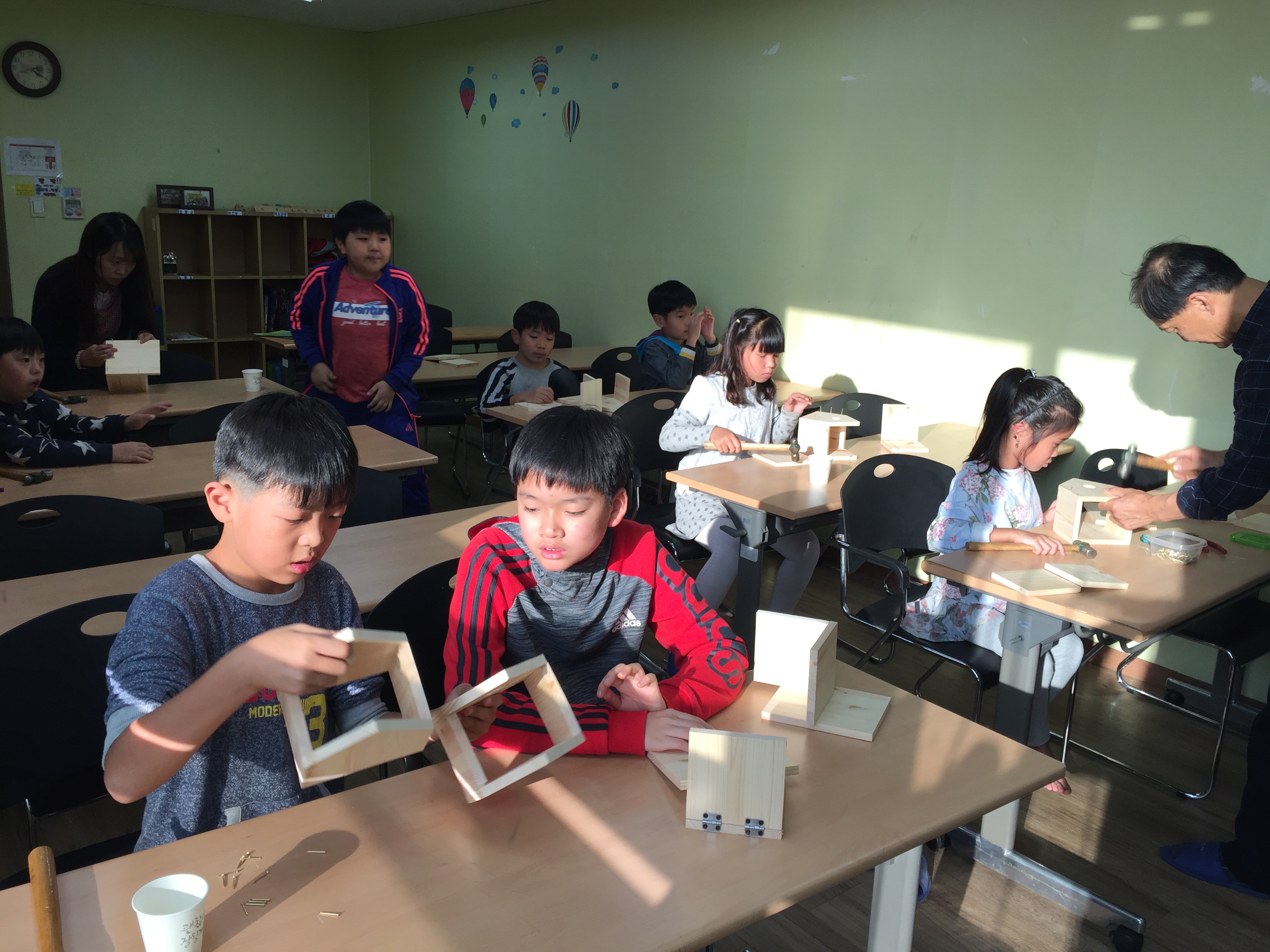 고사리 같은 손으로 열심히 사포질 하고 못질하여 예쁘게 만든 작품들을 센터 교실 입구에 전시를 해보았더니 아이들이 얼마나 좋아하는지!