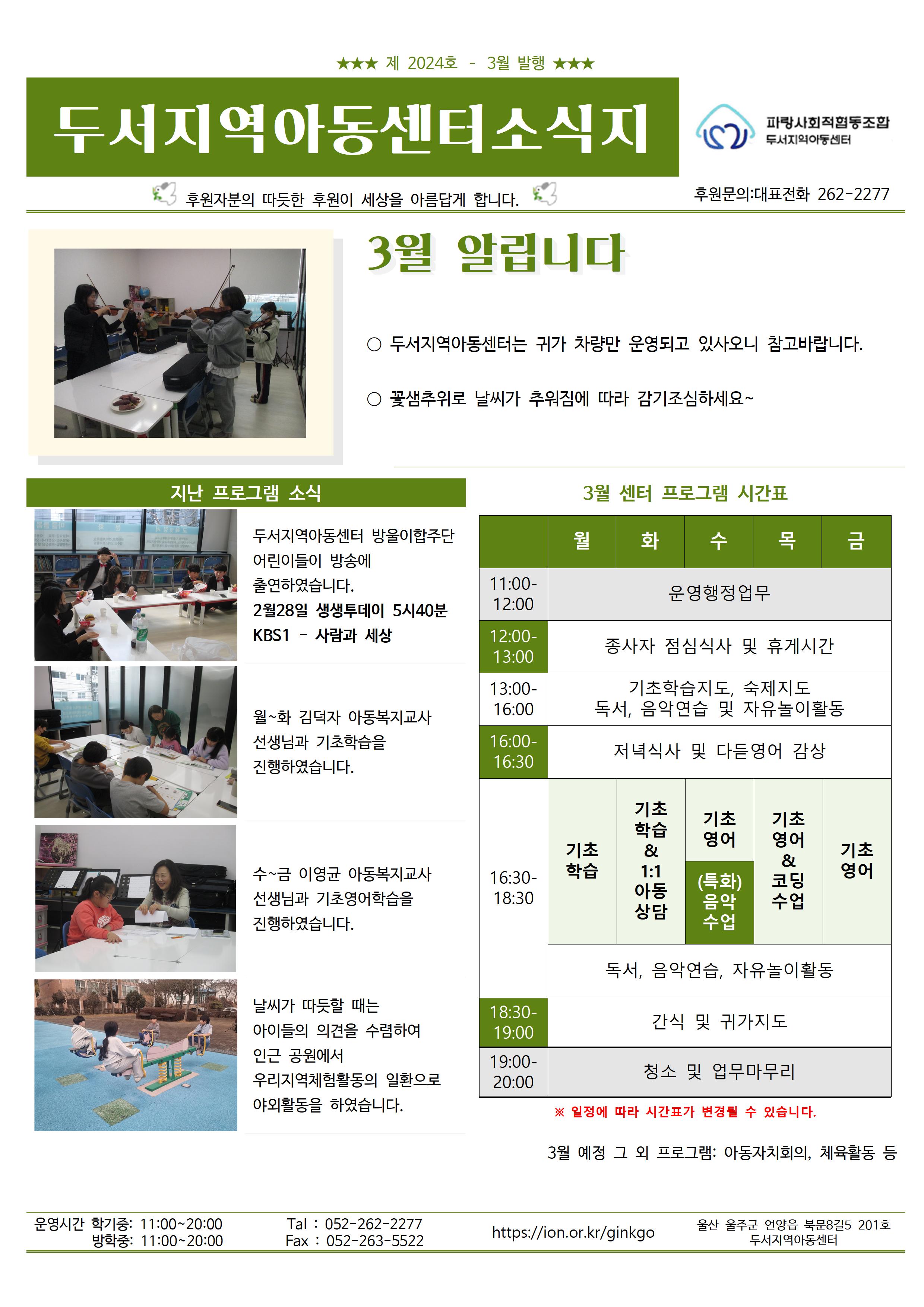 두서지역아동센터 | 울산광역시 울주군 북문8길 5 201호 두서지역아동센터 [지도보기] Tel : 052-262-2277 Fax : 052-263-5522 E-mail : bkg6088@daum.net