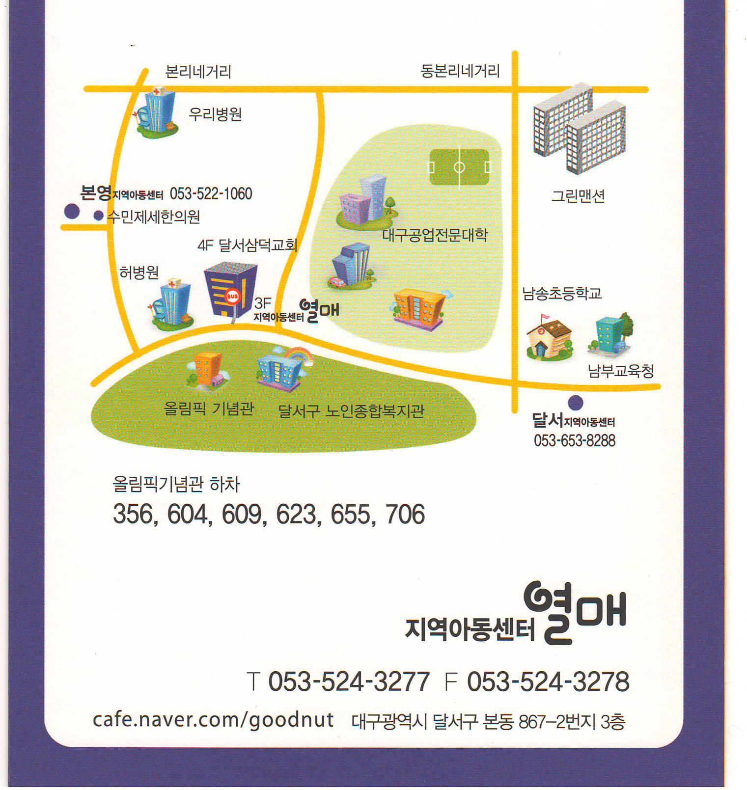 열매지역아동센터 | 대구광역시 달서구 학산로 133 [지도보기] Tel : 053-524-3277 Fax : 053-524-3278 E-mail : goodnuts@naver.com