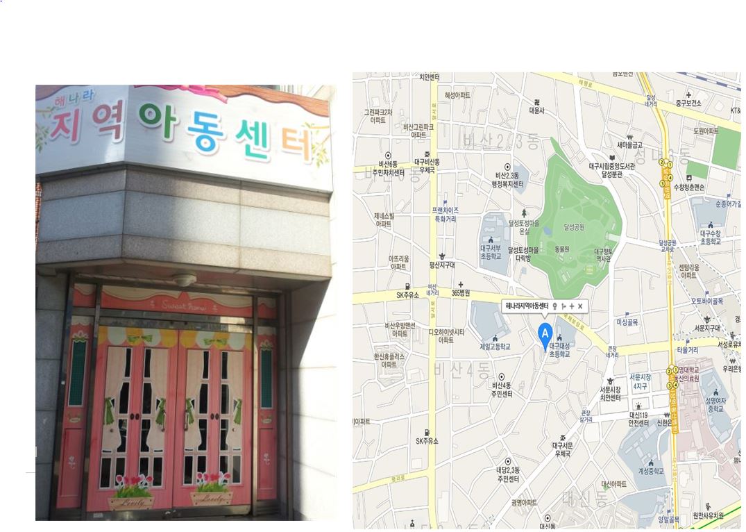해나라지역아동센터 | 대구광역시 서구 달서로12길 63-0 2층 비산동 2층 [지도보기] Tel : 053-573-2354 Fax : 053-564-2355 E-mail : hhhhh25846@hanmail.net