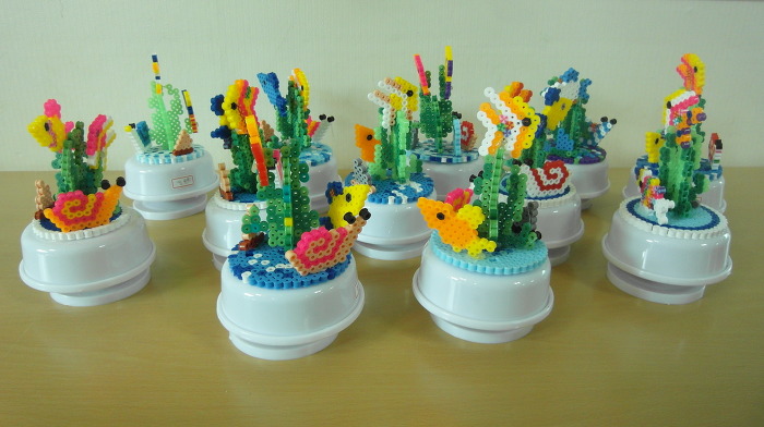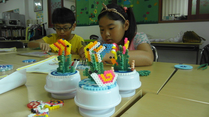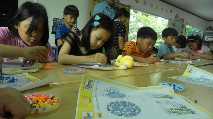 원형판, 해초와 물고기 등 좋아하는 모양대로 색색별 비즈를 올려 놓는 모습이 아주 의젓합니다