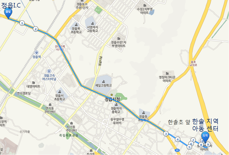 태인IC → 영창아파트 → 동초등학교 → 정읍사랑병원 → 현대1차아파트 → 한솔지역아동센터