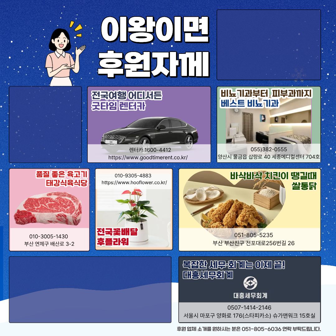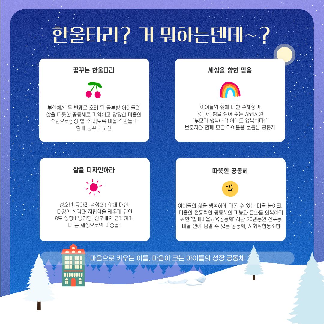 한울타리지역아동센터 | 부산광역시 부산진구 서전로57번길 29 효명빌딩 4층 (전포동) [지도보기] Tel : 051-805-6036 Fax : 051-805-6038 E-mail : hanultari1991@hanmail.net