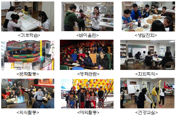 매일 기초학습(국,수,사,과,영)이 진행되며 아동의 욕구에 맞추어 한자, 역사, 미술, 바이올린 등 여러가지 프로그램을 진행합니다.