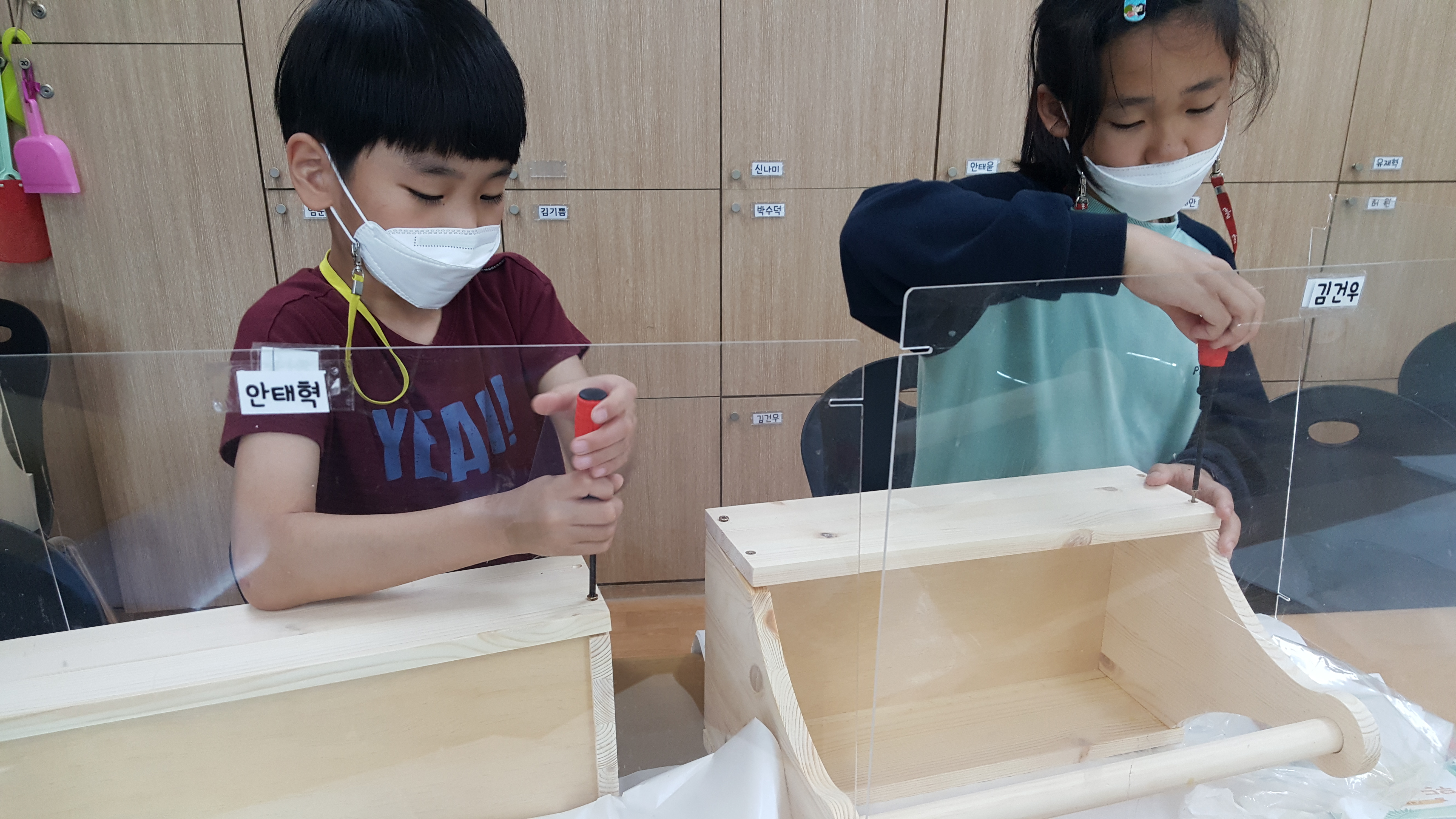 사포질부터 조립하기까지 저학년들은 힘이 들었지만, 힘을 주어 나사를 돌려야 튼튼한 작품을 만들수 있다는 격려에 땀을 흘리면서 열심히~~~