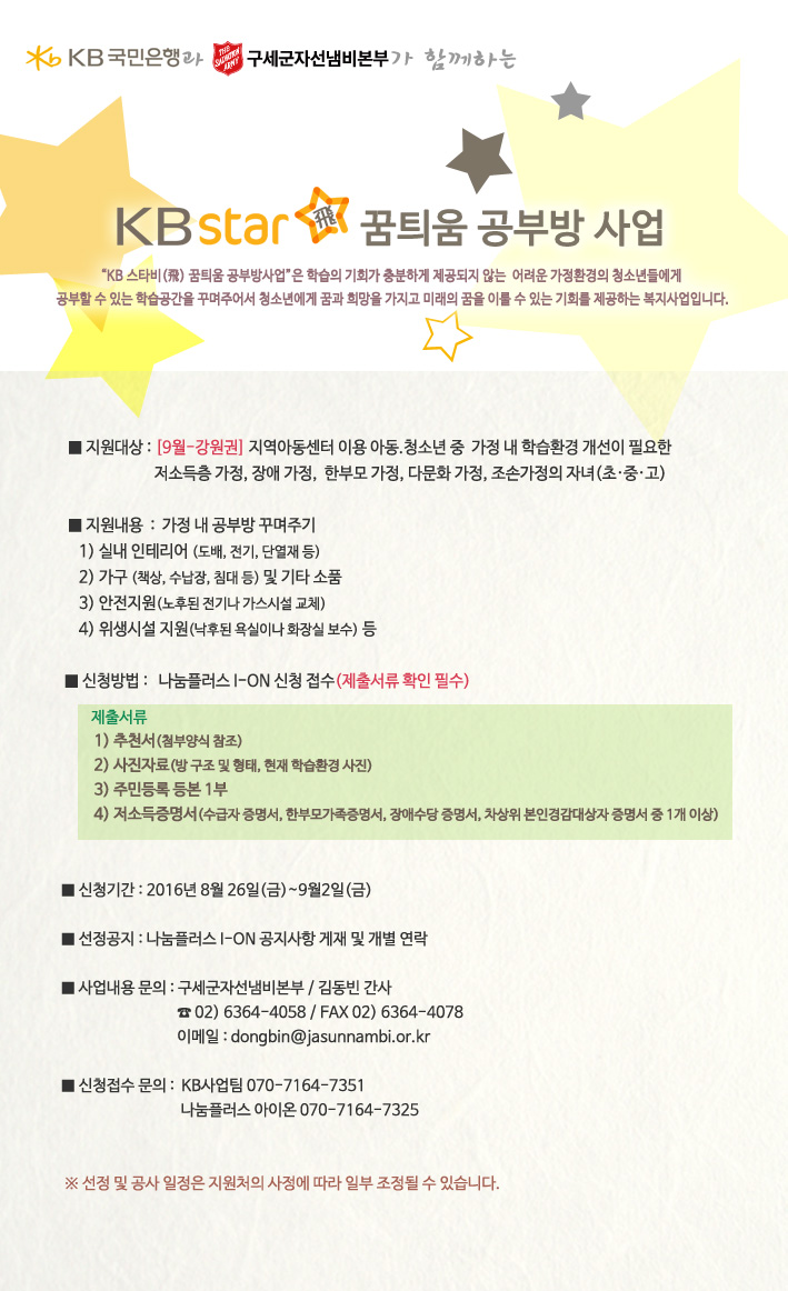 접수기간 : 2016-08-26 ~ 2016-09-02 지원처 : 구세군자선냄비본부