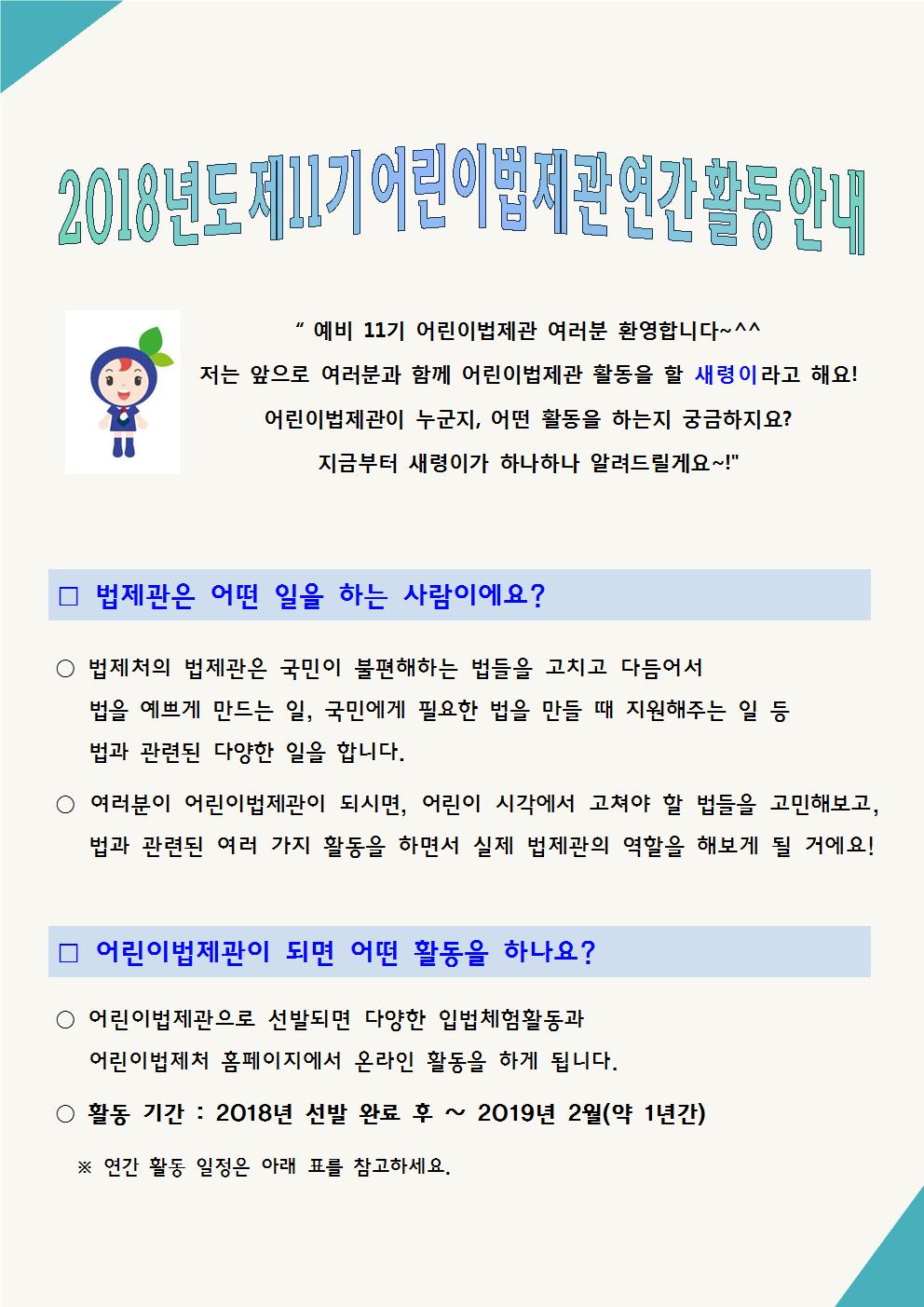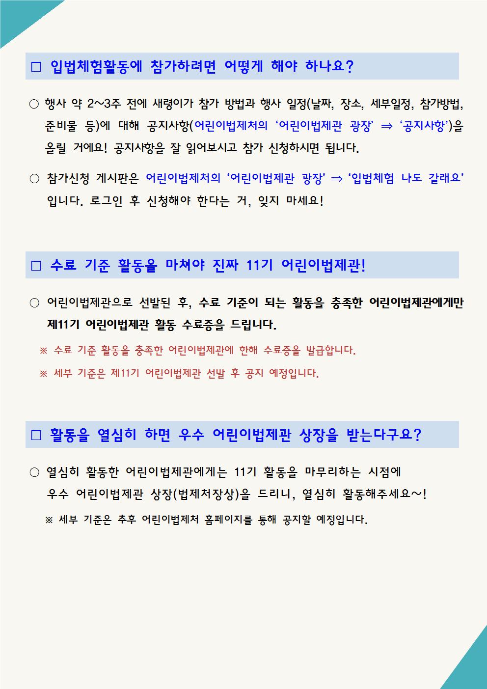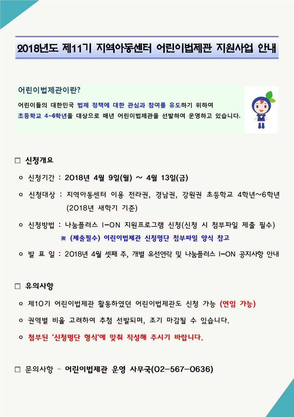 [프로그램] 제11기 지역아동센터 어린이법제관 2차 추가 모집 안내(전라권,경상권,강원권)