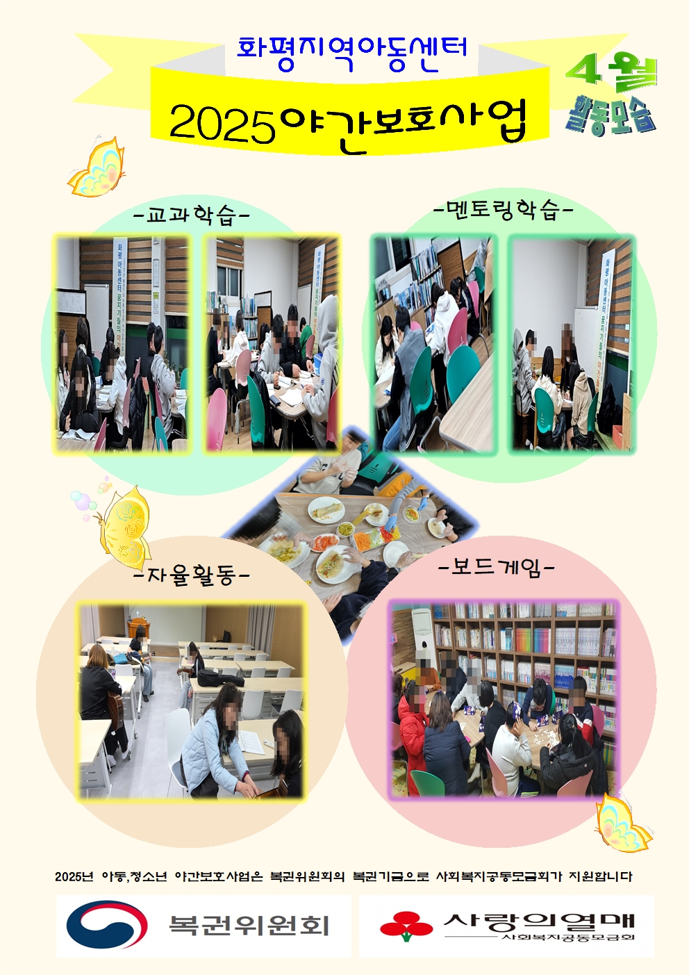 2025년 5월 야간보호 활동 이야기화평지역아동센터 | 경기도 의정부시 비우로20번길 25 (가능동) [지도보기] Tel : 031-838-7782 Fax : 031-838-7783 E-mail : light2421@hanmail.net