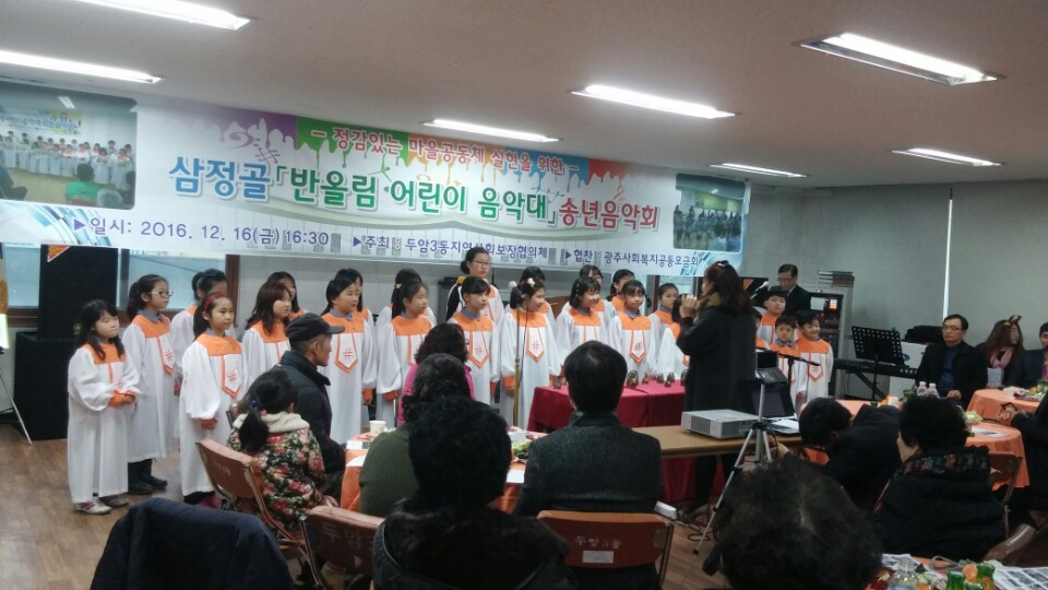 두암3동주민센터에서 주최한 두암골 송년음악회에서 우리 아이들이 그동안 연습했던 합창과 피아노, 난타공연을 선보였습니다.