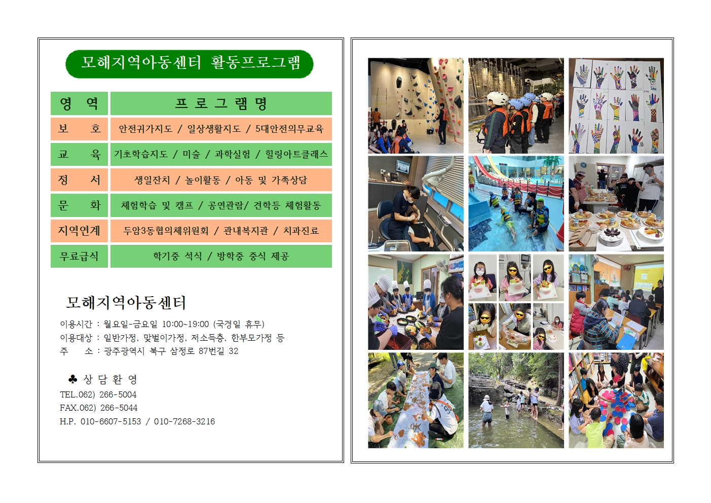 모해지역아동센터 | 광주광역시 북구 삼정로87번길 32 두암동 [지도보기]    Tel : 062-266-5004  Fax : 062-266-5044  E-mail : ahgo5004@naver.com