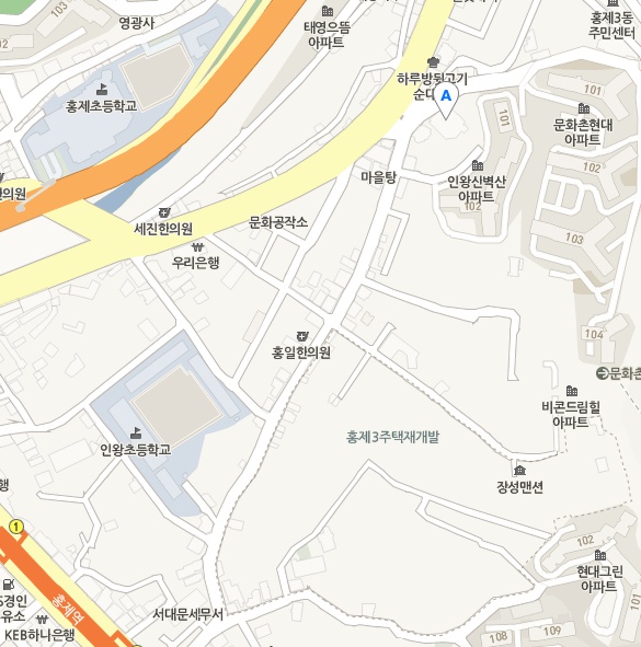 지하철 3호선 홍제역 하차 시 1번출구 앞 마을버스 07번, 08번 이용하여 문화촌현대아파트에서 하차후 우측으로 도보 50m