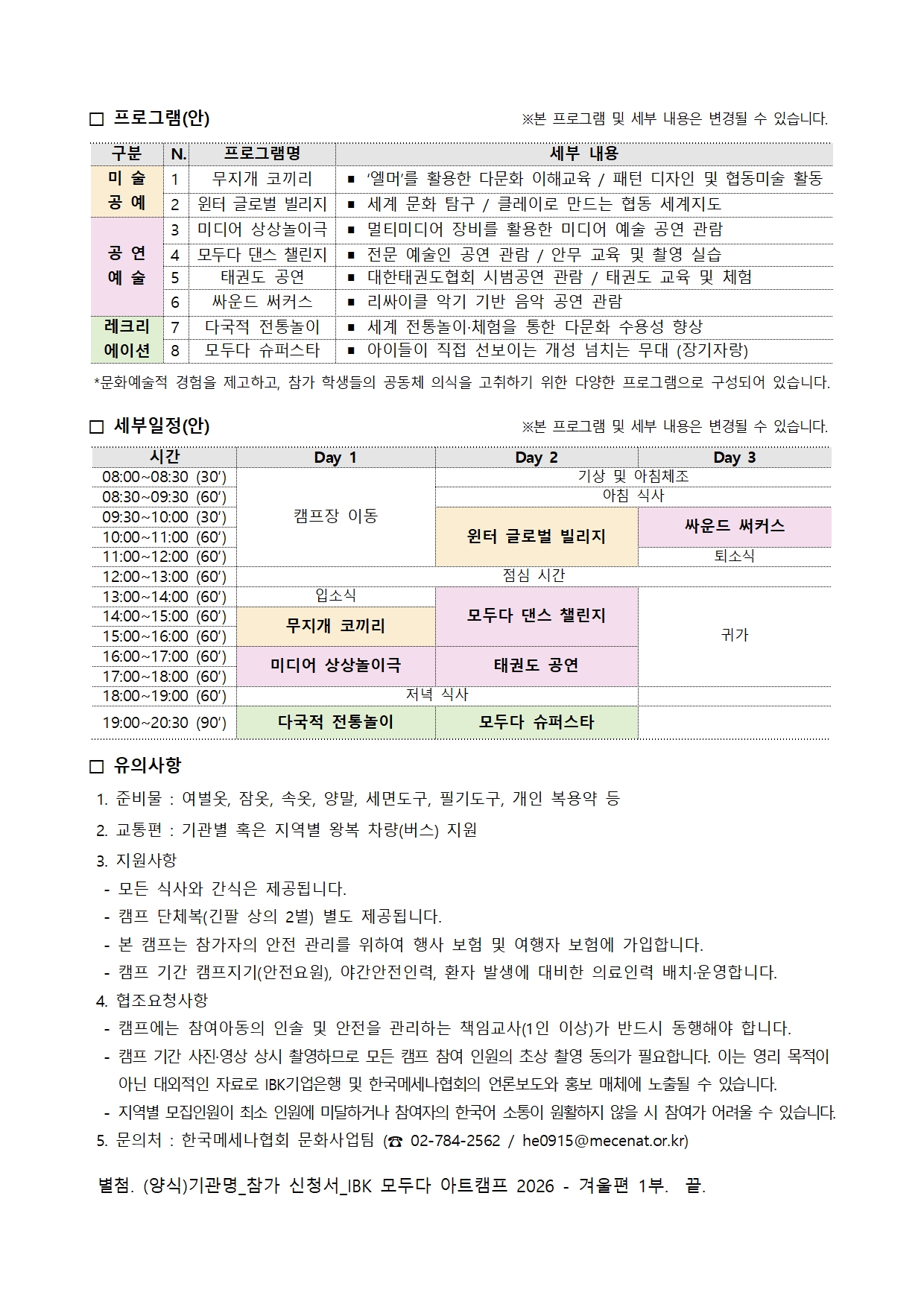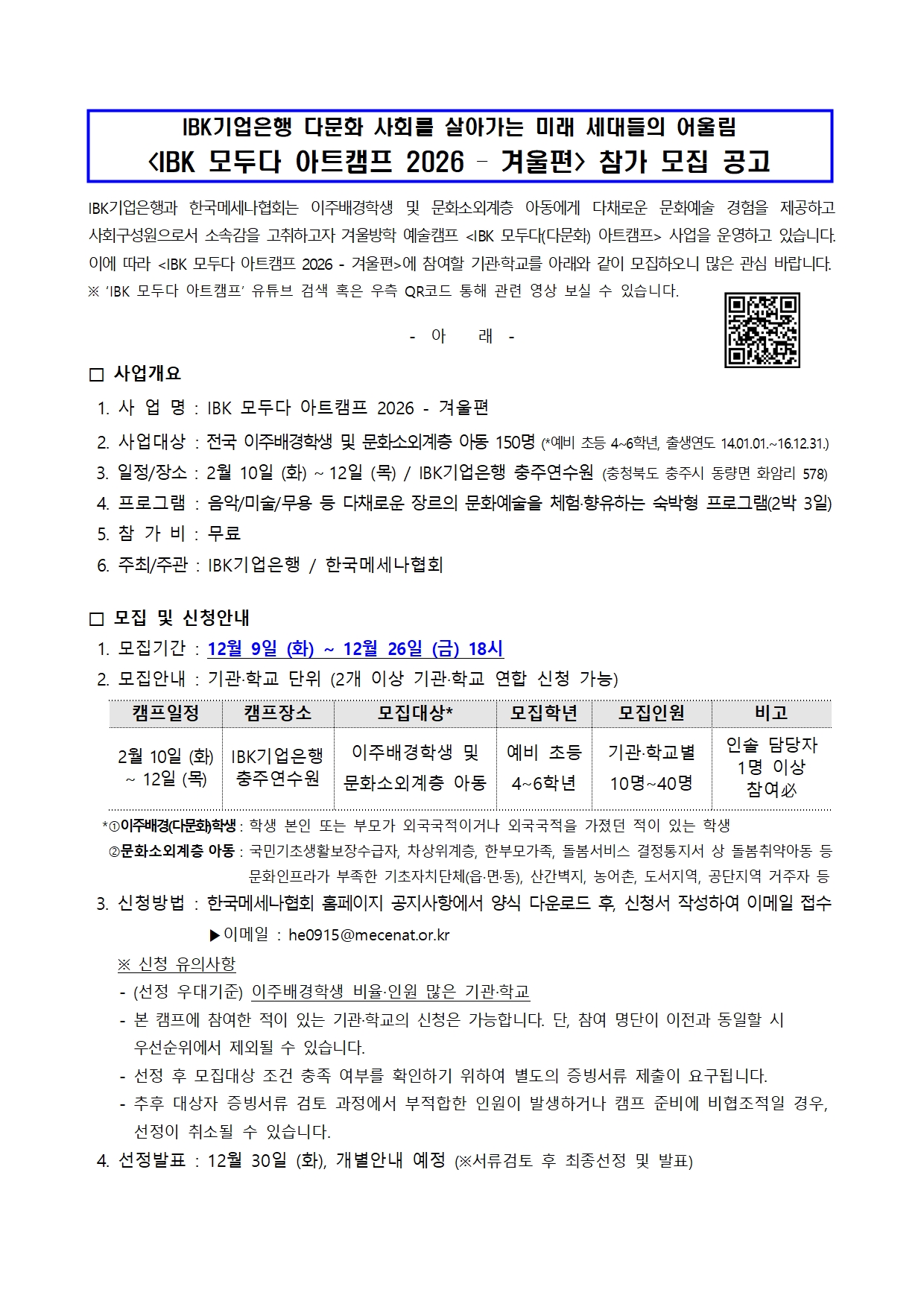 IBK기업은행 「IBK 모두다 아트캠프 2026 - 겨울편」 참가 모집 안내