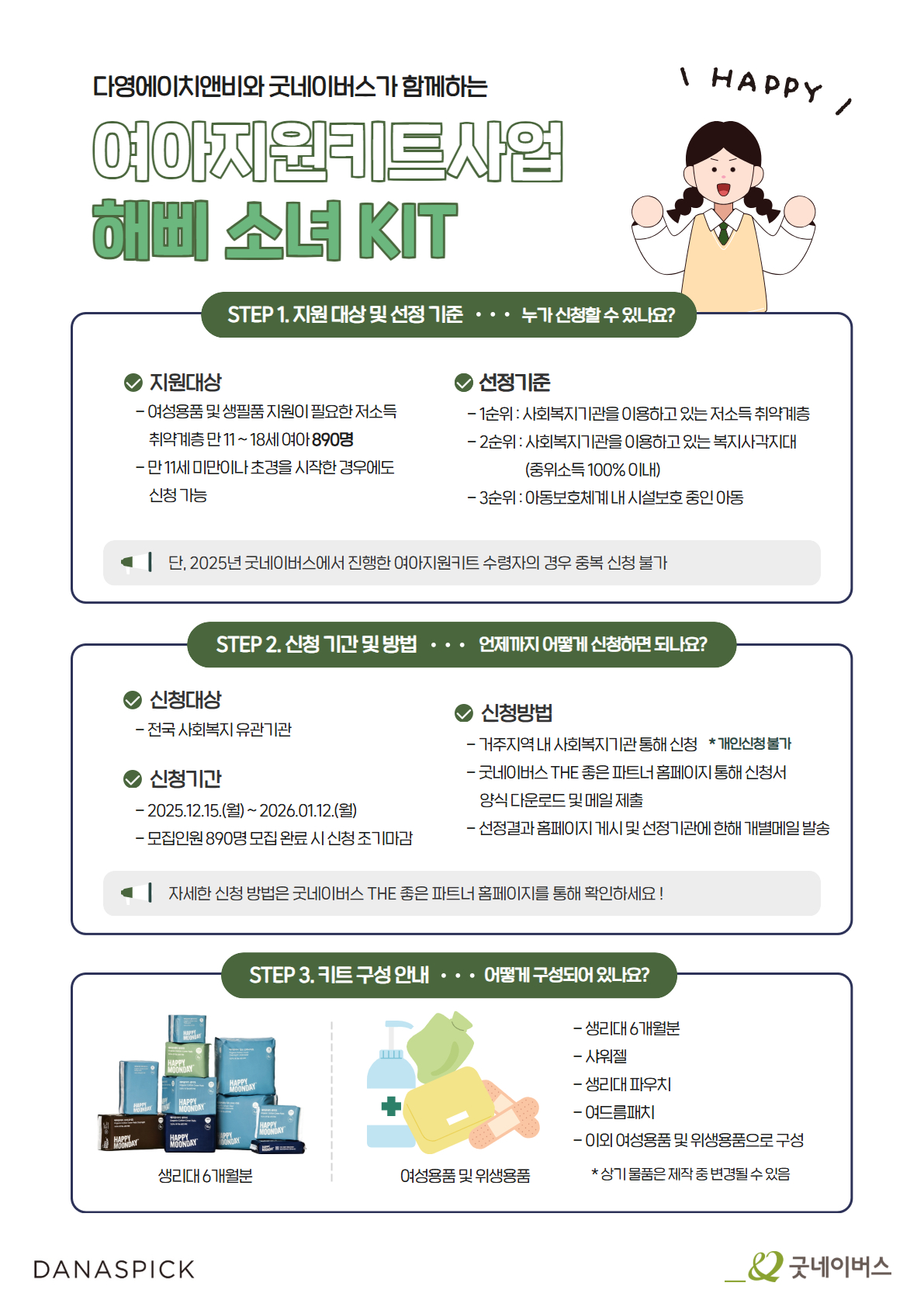 다영에이치앤비와 굿네이버스가 함께하는 여아지원키트사업 해삐 소녀 KIT 대상자 모집