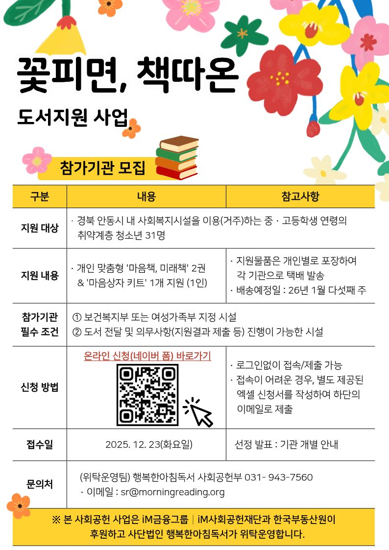 ※ 본 사회공헌 사업은 iM금융그룹│iM사회공헌재단과 한국부동산원이 후원하고 사단법인 행복한아침독서가 위탁운영합니다.