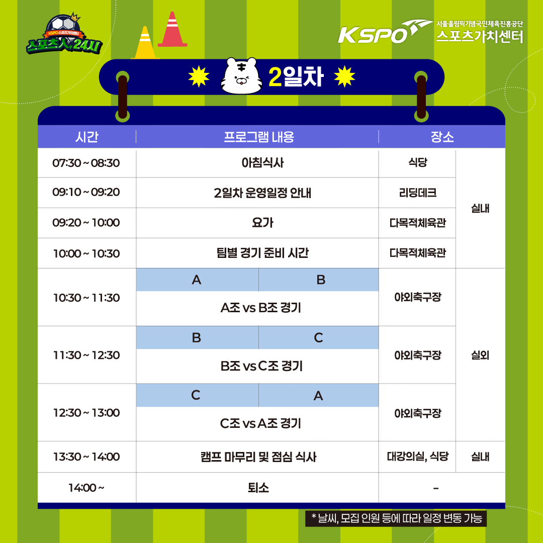 - 참가비용 : 식비 21,000원(3식) * 스포츠 프로그램, 간식, 3인 1실 숙소, 스포츠장갑, 생수 등 무료 제공