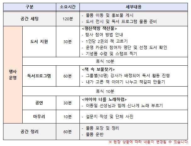 - 필요물품: 도서지원 테이블(1500mm이상) 8개 이상, 독서프로그램 참여 인원수만큼 테이블, 의자 등