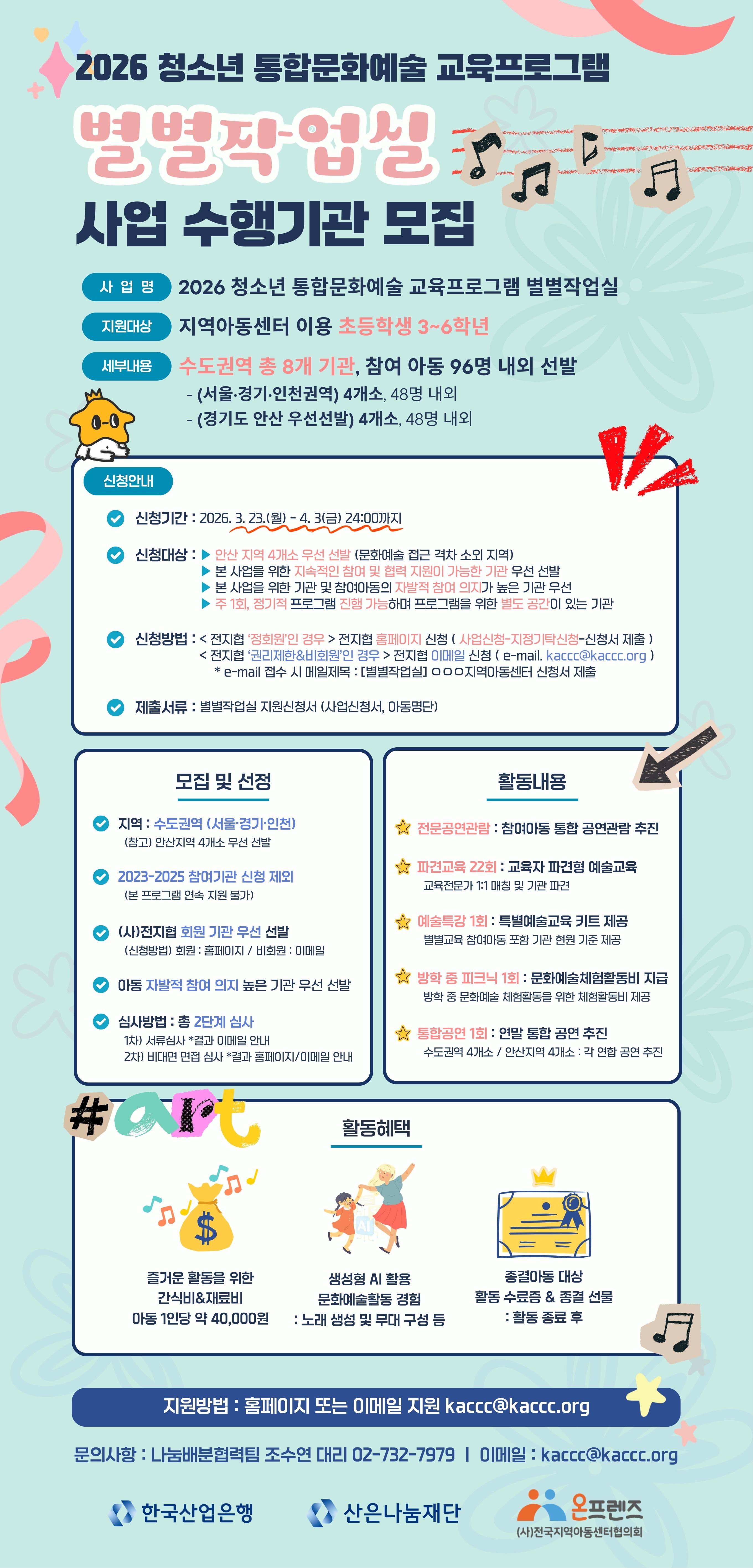 - 사업명: 2026 청소년 통합문화예술 교육프로그램 ‘별별작업실’