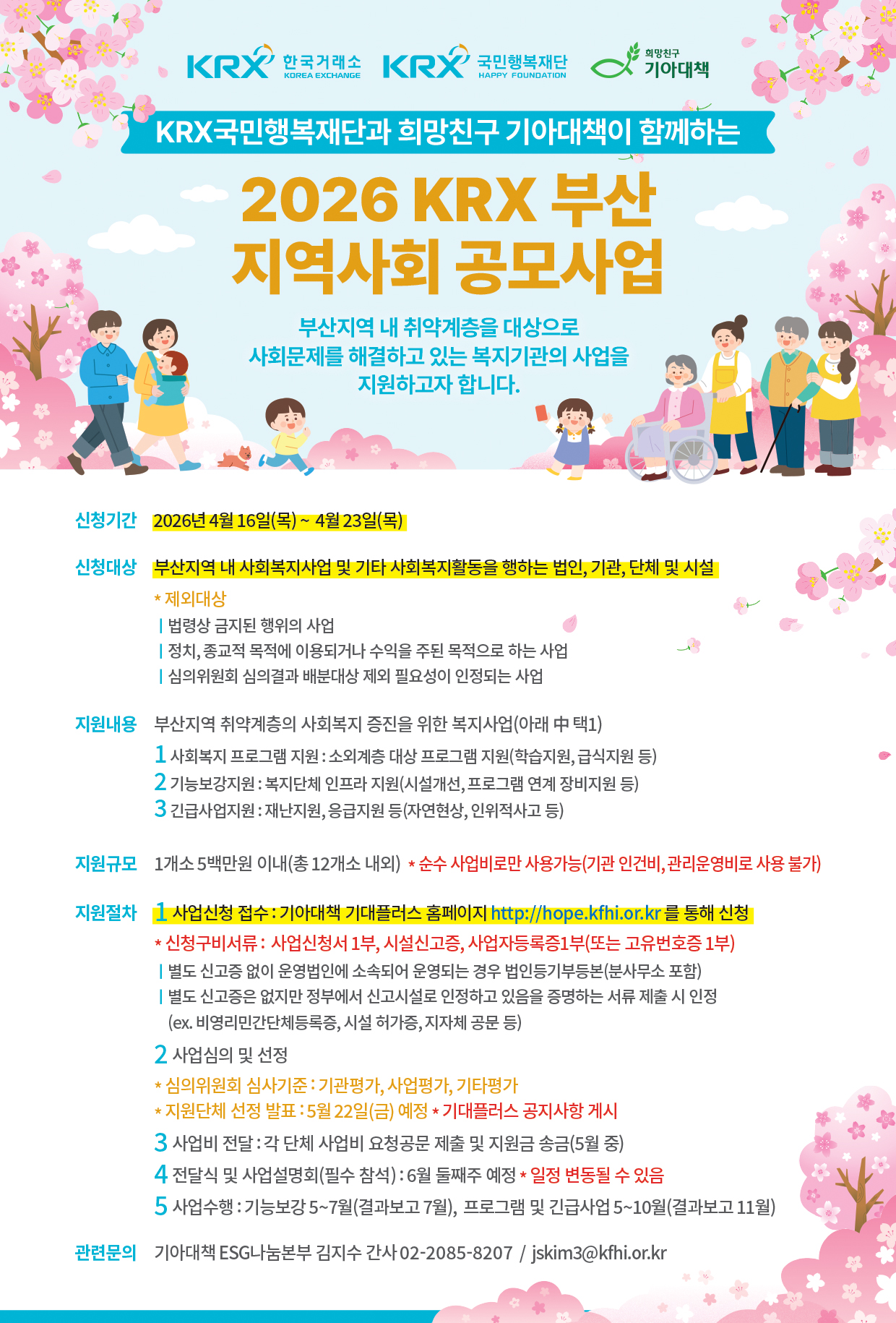 부산 지역 내 취약계층을 대상으로 사회문제를 해결하고 있는 복지기관들을 지원하고자 '2026 KRX 부산 지역사회 공모사업'을 진행합니다.