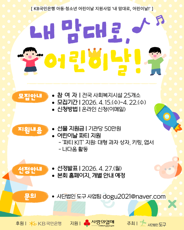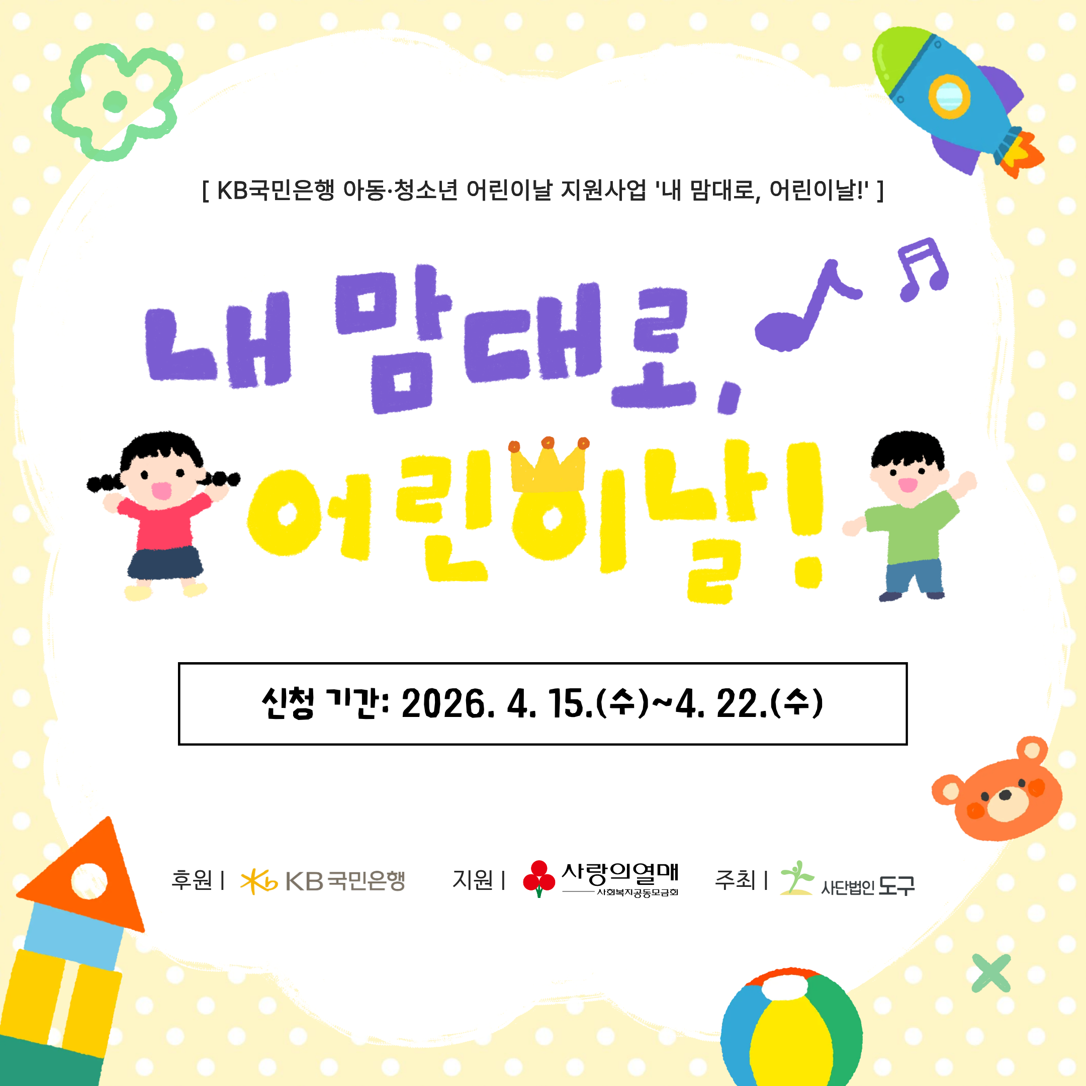 KB국민은행 아동·청소년 어린이날 지원사업 ‘내 맘대로, 어린이날!’ 사업 참여 기관을 모집합니다.