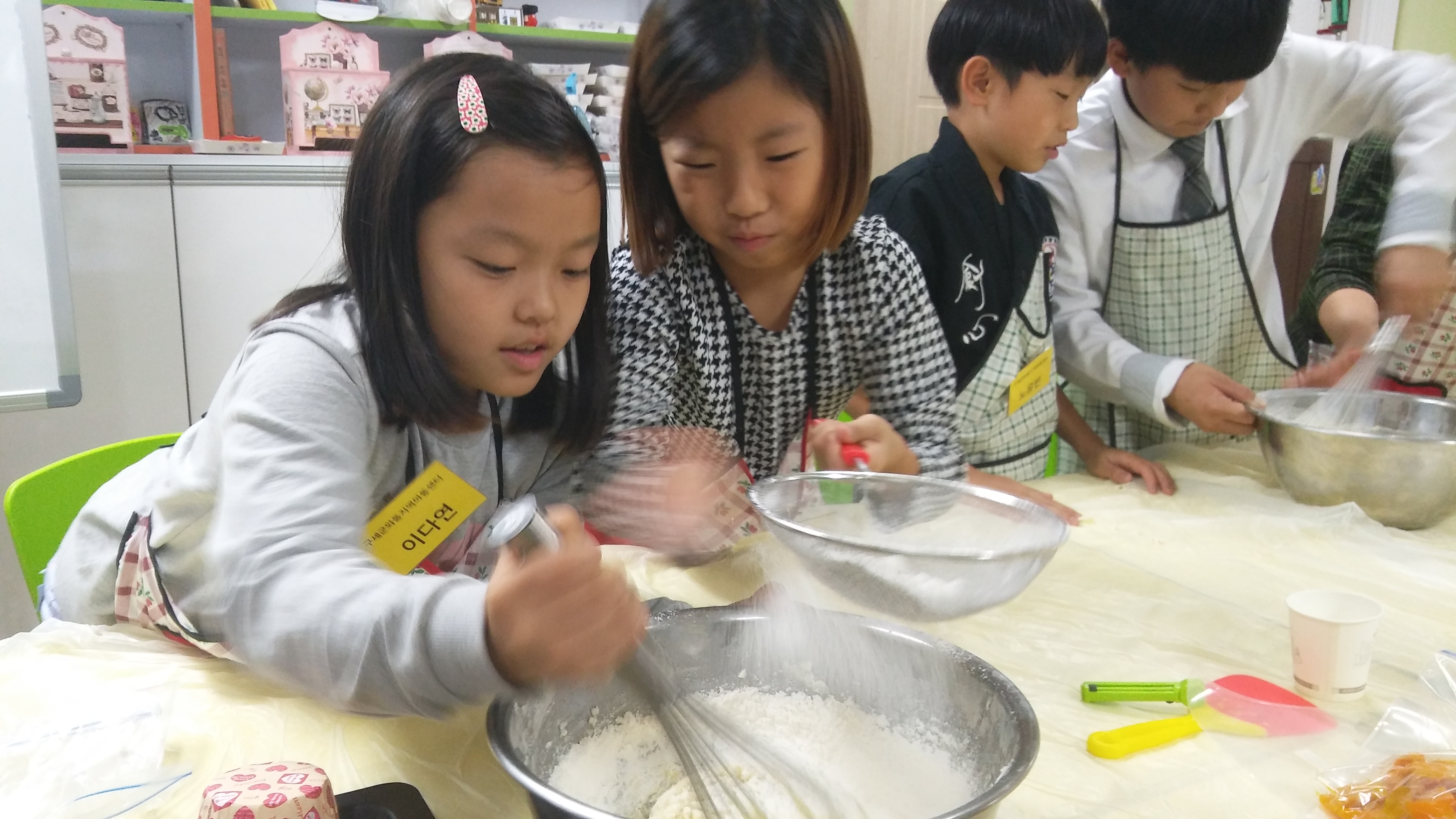 서로 협동하여 머핀 반죽하기