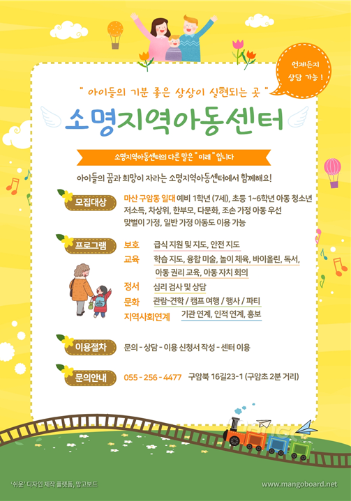 소명지역아동센터 | 경상남도 창원시 마산회원구 구암북16길 23-1 구암동 (구암동) [지도보기]    Tel : 055-256-4477  Fax : 0504-267-9477  E-mail : somyung2015@daum.net