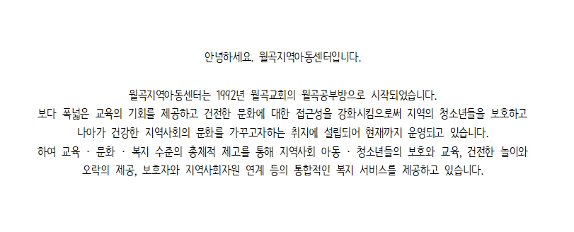 월곡지역아동센터 | 서울특별시 성북구 정릉로52길 22 401호 (돈암동) [지도보기]    Tel : 02-914-4302  Fax : 02-942-6139  E-mail : wgchild1992@naver.com