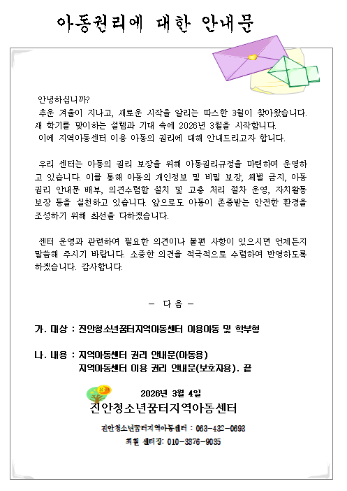 2026년 진안청소년꿈터지역아동센터 이용 권리 안내문