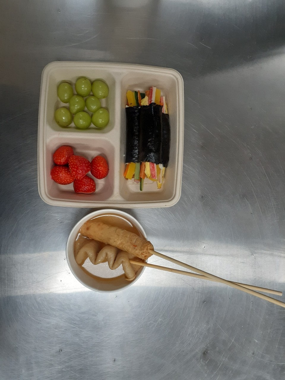 자의 식사량에 맞춰 어느정도의 융통성을 갖고 김밥양을 맞춰 주었다 다 만든 김밥을 선생님들이 준비해주신 상자 도시락에 차곡차고 가지런히 놓고 샤인머스캣과 딸기도 도시락에 넣어 아이들의 오늘의 저녁식사가 완성되었다