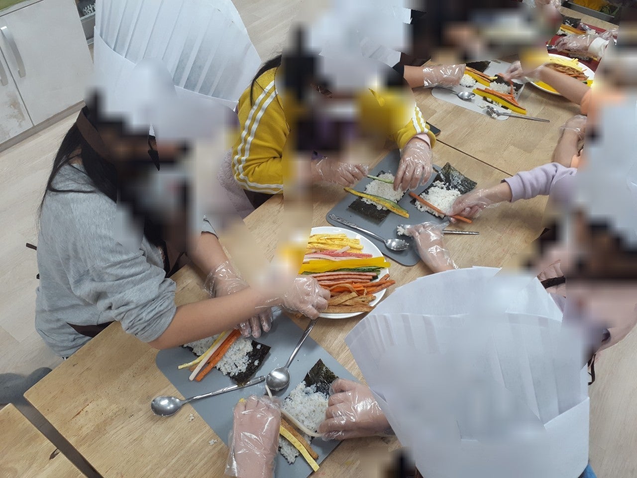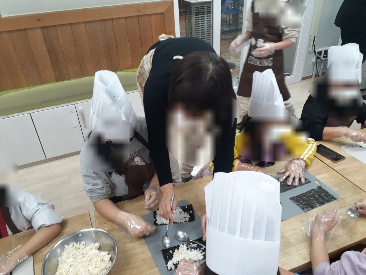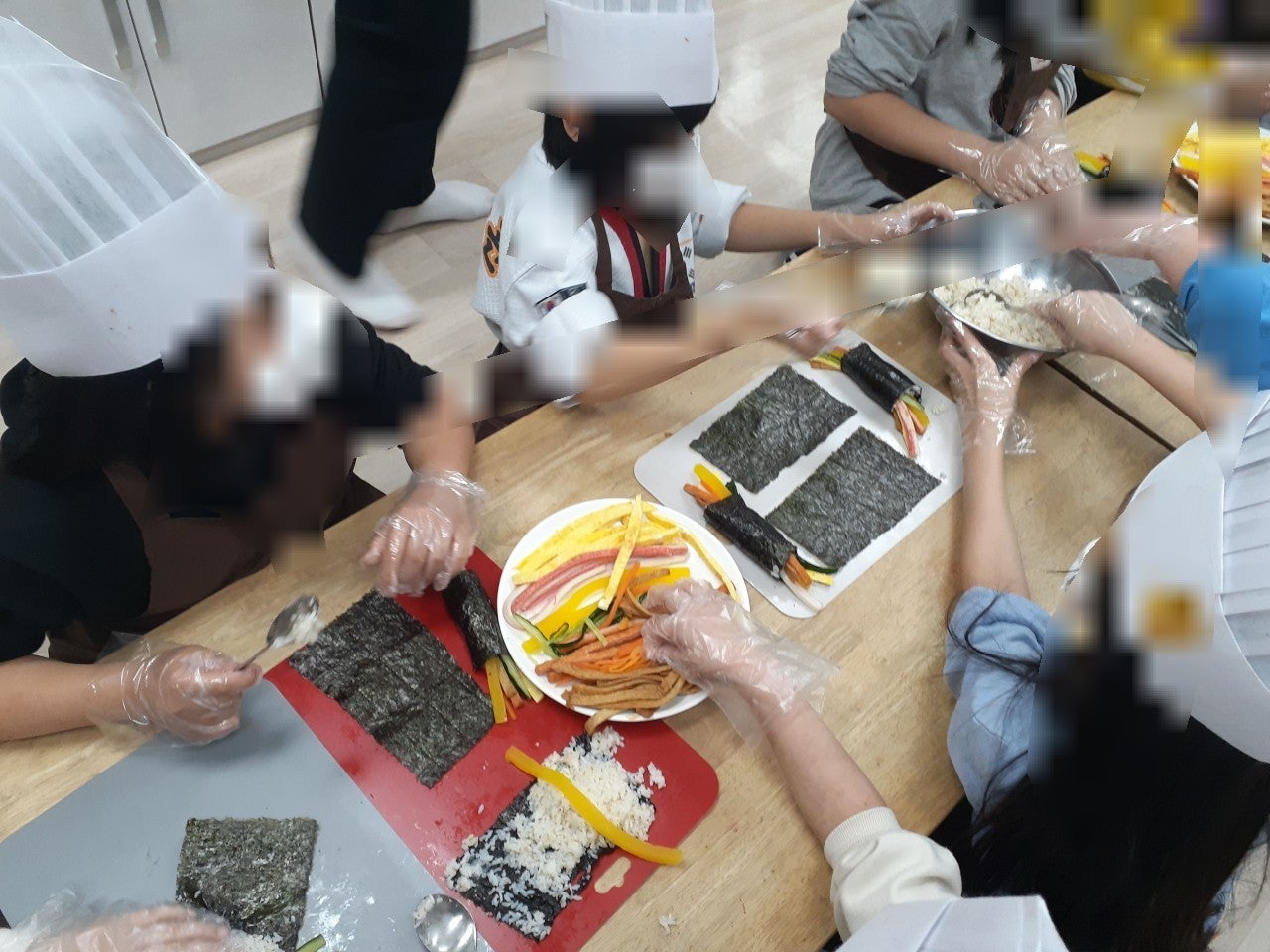 아이들은 직접 만든 맛있는 것을 먹을 생각에 신나하였다 이번 요리시간은 꼬마김밥 만들기를 하였다 일반적인 김밥과는 달리 김을 세로로 펼쳐 재료가 옆으로 빠져나오는 모습으로 만드는 것이다