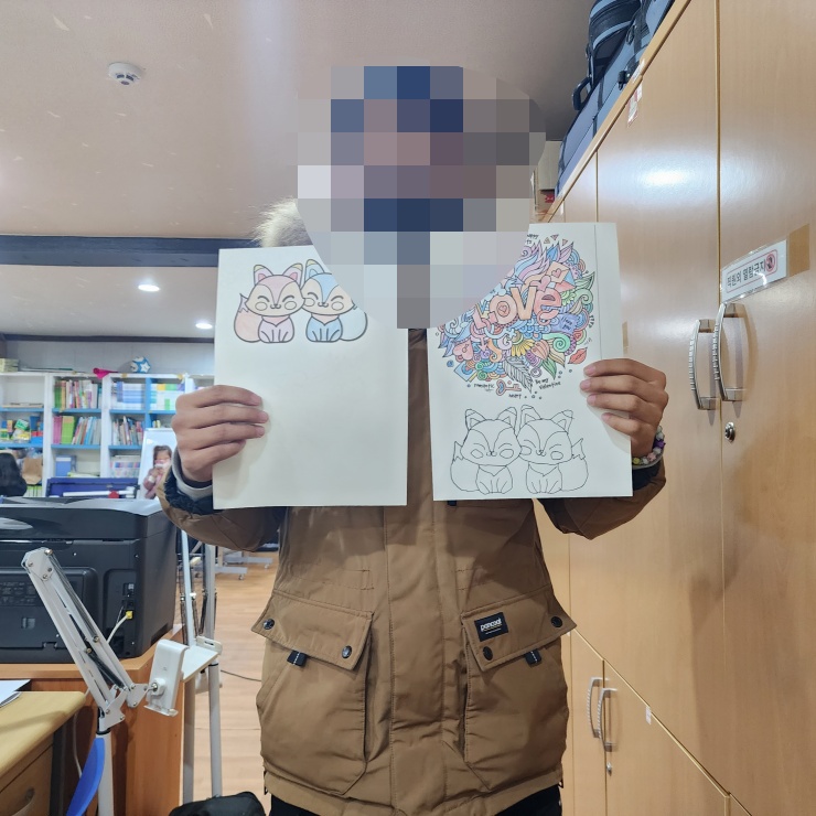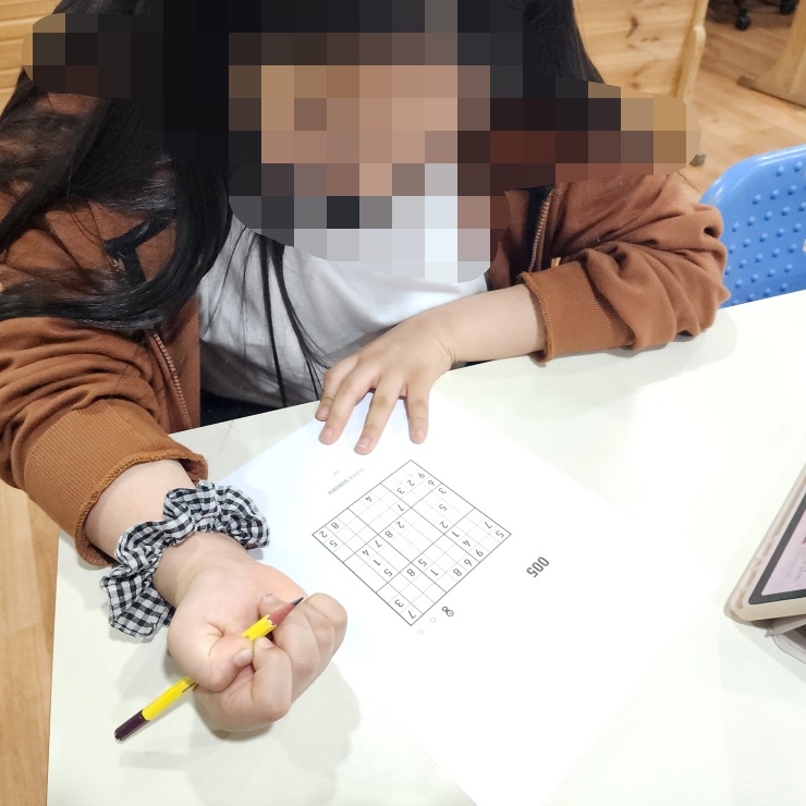 아이는 방법을 알려준 후 다른 아이와 함께 스도쿠를 풀어보기로 하였다. 아이는 크게 자신이 없어 다른 아이의 도움을 받아 활동을 실시하려했으나 아쉽게도 다른 아이와 다른 스도쿠 도안을 받아 아이 본인의 힘으로 스도쿠를 풀어나갔다. 처음엔 다소 어려워하는 모습을 보였지만 점차 익숙해지며 규칙을 찾아나갔다. 어떤 아이는 평소 학습이 마친 후 색칠하던 만다라를 이어서 색칠하였다. 아이는 만다라 색칠에 일가견이 있어 보다 빠른시간 내에 작품을 만들어냈고, 아이의 활동을 보던 다른 아이들도 짱구색칠 도안을 뽑아 아이 옆에 앉아 색칠을 하였다. 다른 아이들은 함께 보드판에 그림을 그린 후 어떤 만화를 나타낸 것인지 맞추는 활동을 실시하였다.