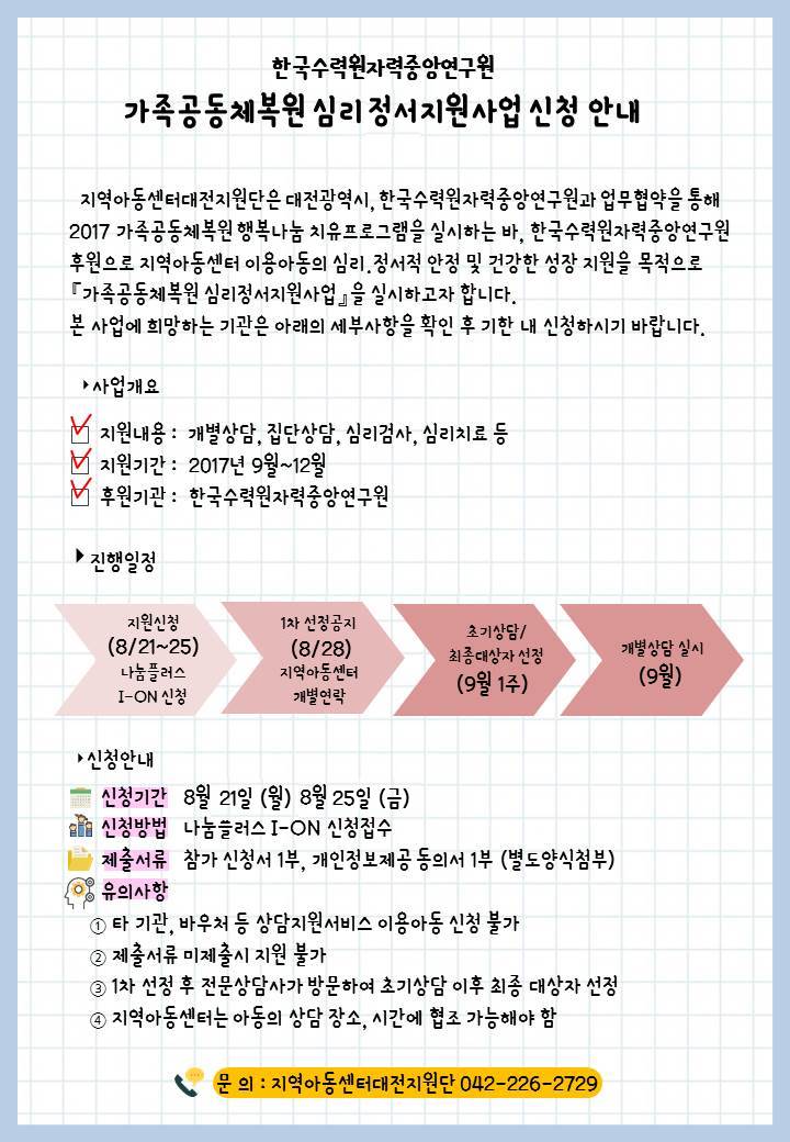 [프로그램] 한국수력원자력(주)중앙연구원 심리정서지원사업 신청 안내