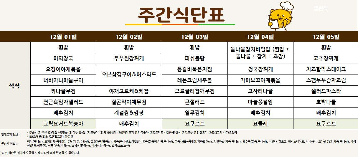 ** 12/5 저녁급식은 특별메뉴로 제공합니다.