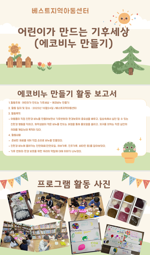 10월25일에는 세이브더칠드런에서 지원으로 어린이가 만드는 기후세상과 관련 베스트지역아동센터에서는 "에코비누 만들기"를 진행 하였습니다.