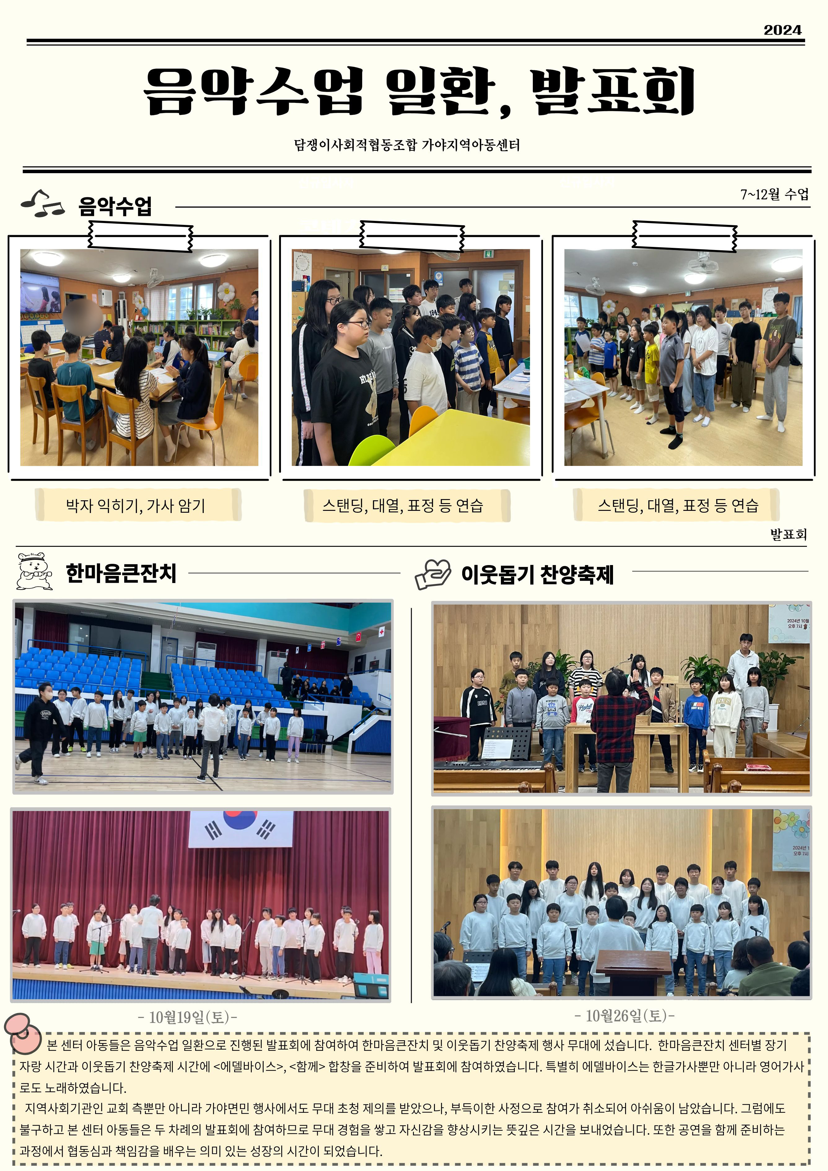 본 센터 아동들이 24년도 음악수업 일환으로 두 차례 발표회에 참여하였습니다.