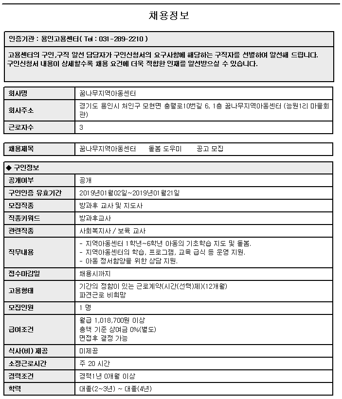 2019년 꿈나무지역아동센터 <돌봄도우미> 공고 모집