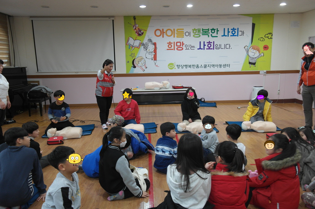 응급처치 교육을 실시했습니다. 위급상황에 호흡을 하지 않고 의식이 없는 대상자에게 인공호흡과 심폐소생술 하는 법을 배웠습니다.
