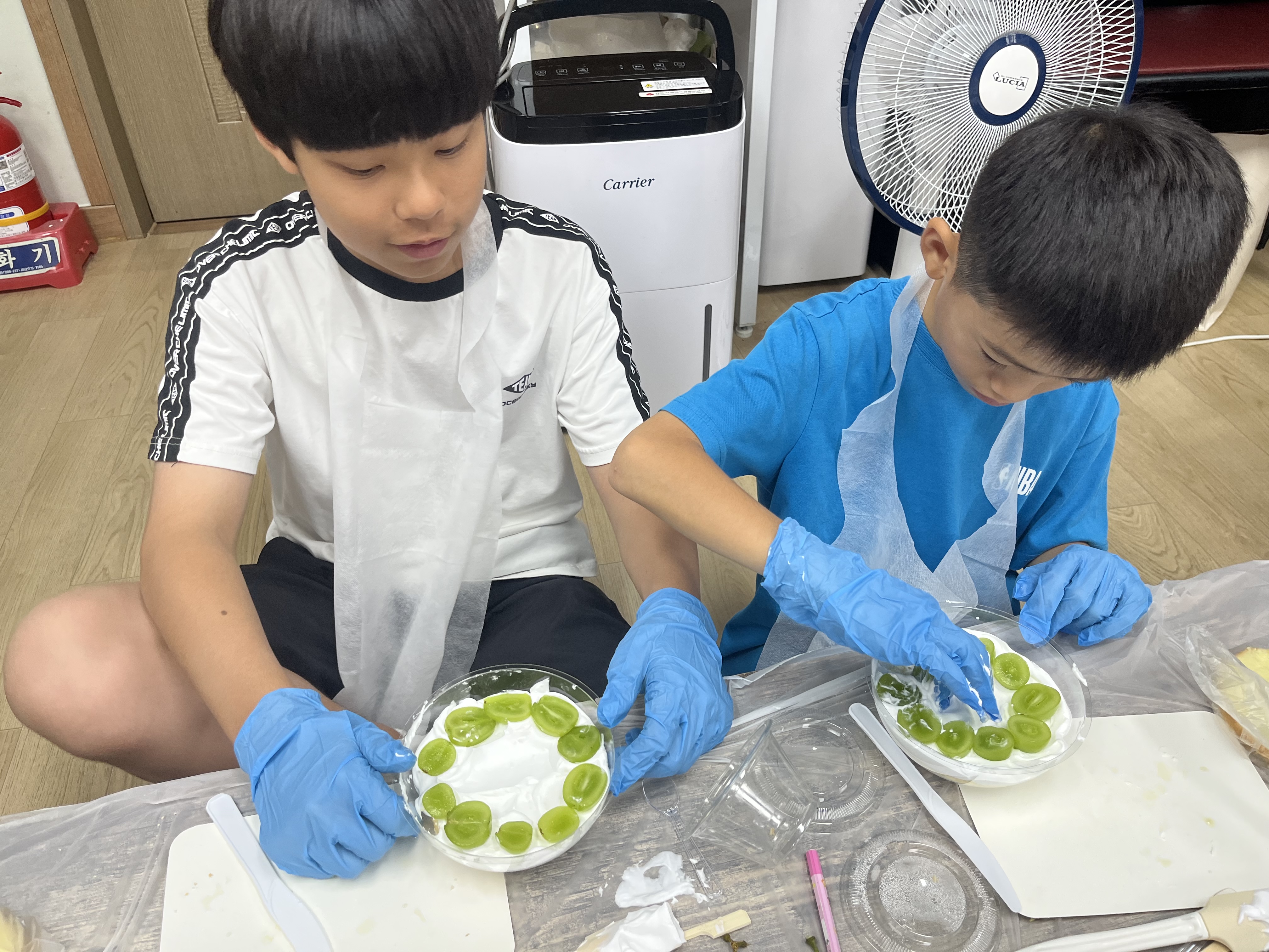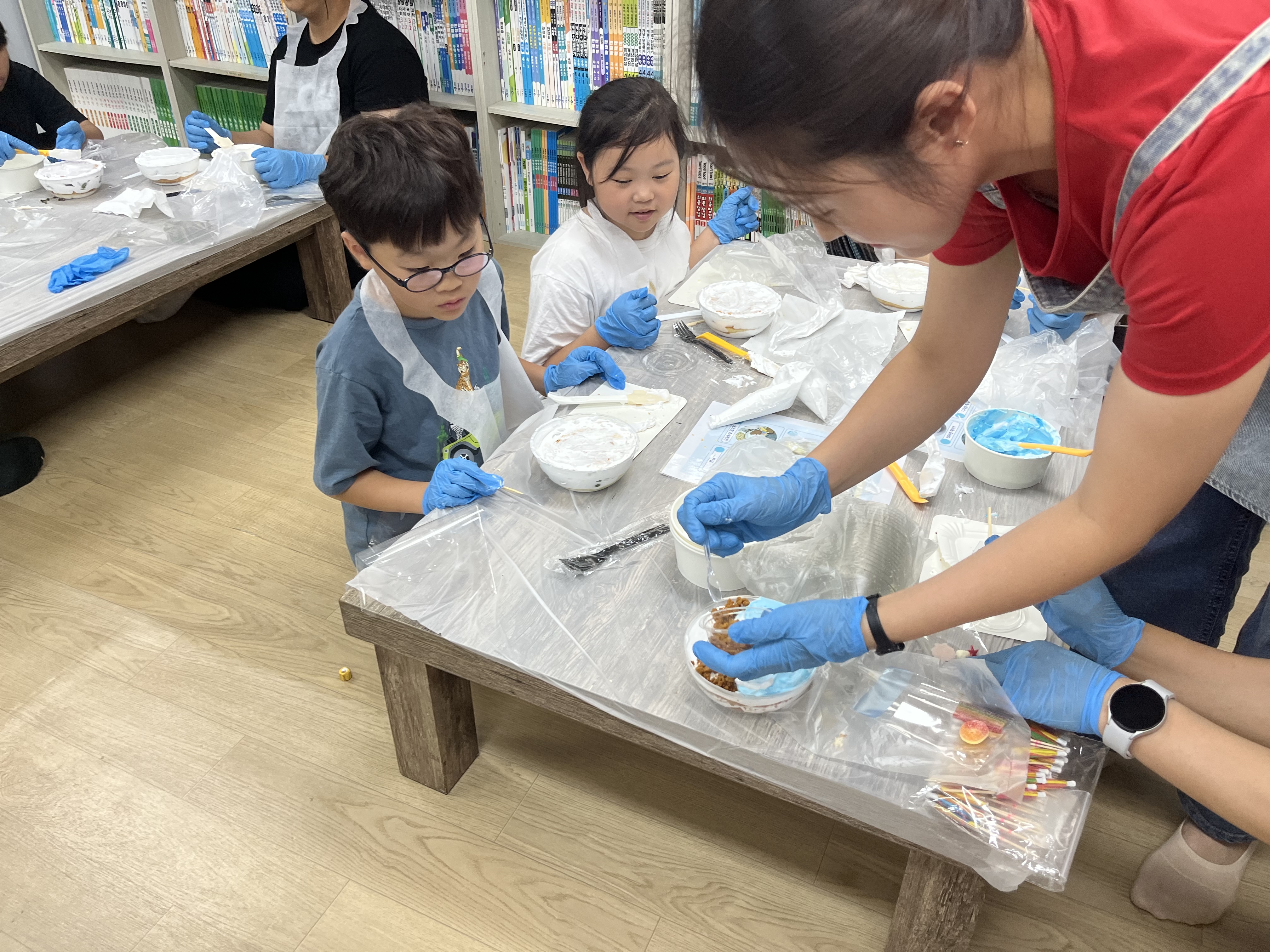 아이들은 생크림을 짜고, 빵을 올리며 케이크를 차근차근 만들어 나갔습니다!